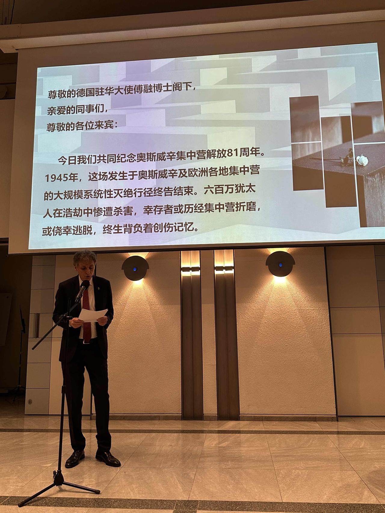 80多年前,犹太人大屠杀(Shoah)造成约600万人丧生,是对犹太人的系统性种族灭绝。铭记历史中这段最黑暗的篇章是德国的道义责任,也是同犹太民族和以色列实现持久和解的唯一途径。德国将继续保持对大屠杀历史的记忆鲜活,打击对大屠杀历史的否认、打击反犹主义和种族歧视——为了守护民主、人权与和平,为了确保犹太社群能够安全生存,能够繁荣发展——在德国、在欧洲、在世界各地。 1月27日, 德国驻华大使馆和以色列驻华大使馆共同举办了缅怀大屠杀受难者国际纪念日活动。 活动中,德国驻华大使傅融博士和以色列驻华大使贝以理共同为两位大屠杀受害者点燃了纪念蜡烛。多位驻华大使,武官,记者,中国学者,以及部分德国使馆粉丝等社会各界人士参加了纪念活动。纪念活动后,放映了记录片《重访特权乐园》。电影展现了大屠杀的创伤如何影响数代人,以及每个个体如何找到自己的方式与过去的阴影共存。