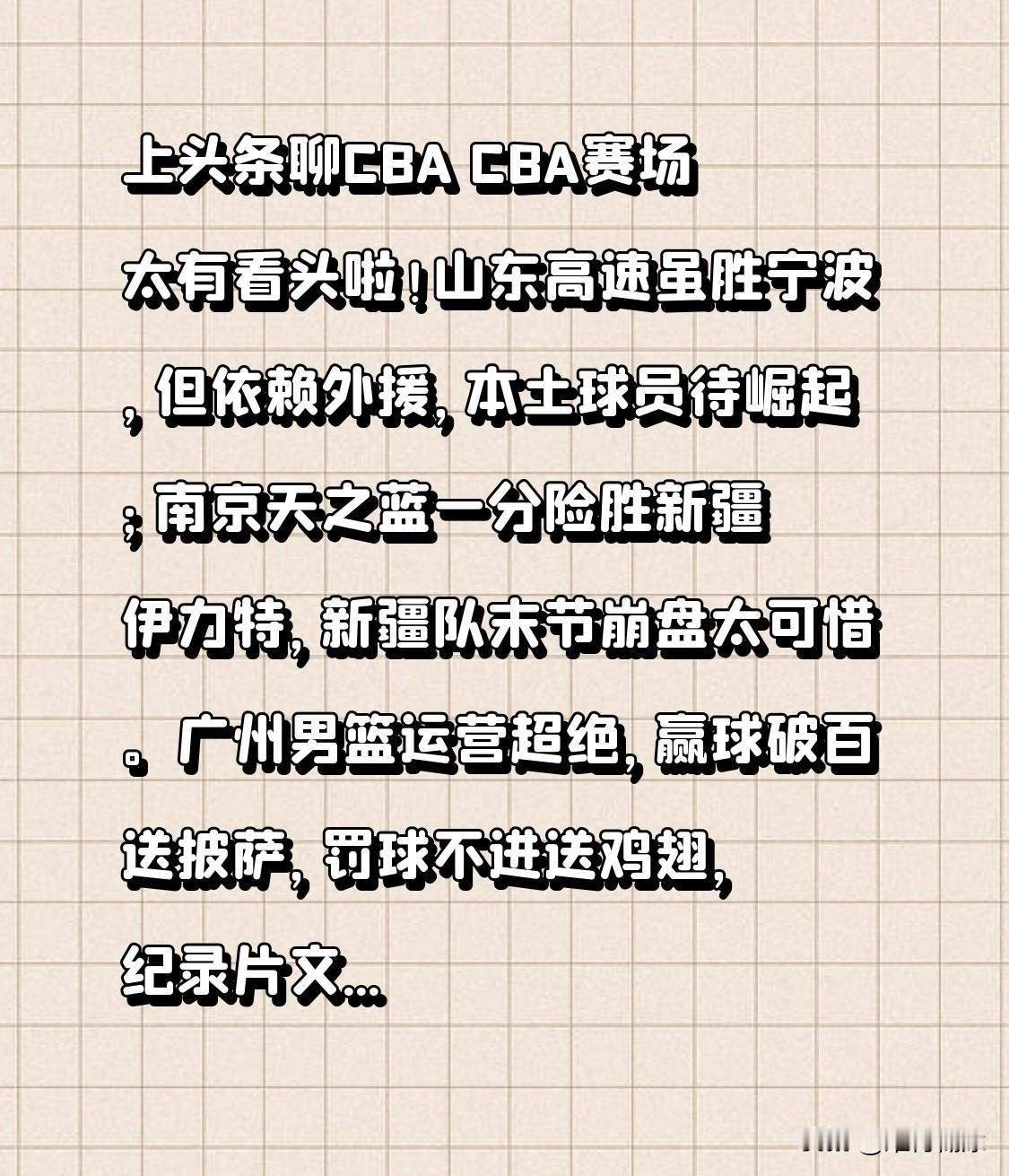 上头条聊CBA CBA赛场太有看头啦!山东高速虽胜宁波,但依赖外援,本土球员待崛起;南京天之蓝一分险胜新疆伊力特,新疆队末节崩盘太可惜。广州男篮运营超绝,赢球破百送披萨,罚球不进送鸡翅,纪录片文案也超吸睛,CBA太精彩!