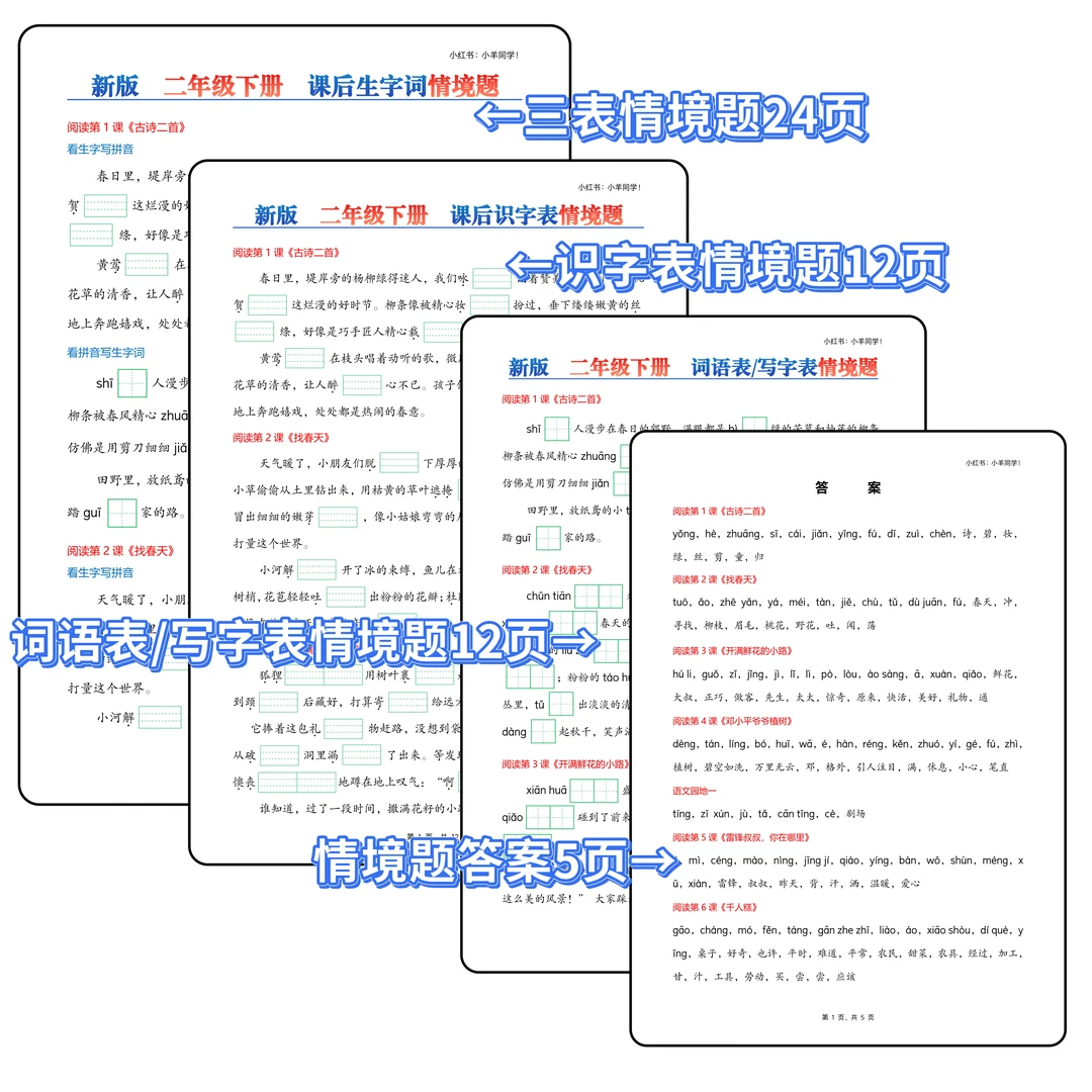 📄考试再也不是简简单单的看拼音写词语啦,都是情景题,这份就是结合课后识字表+写字表+词语表整理的一份“情境”挖空练习题。“大语文”考试方向的必kao题型。