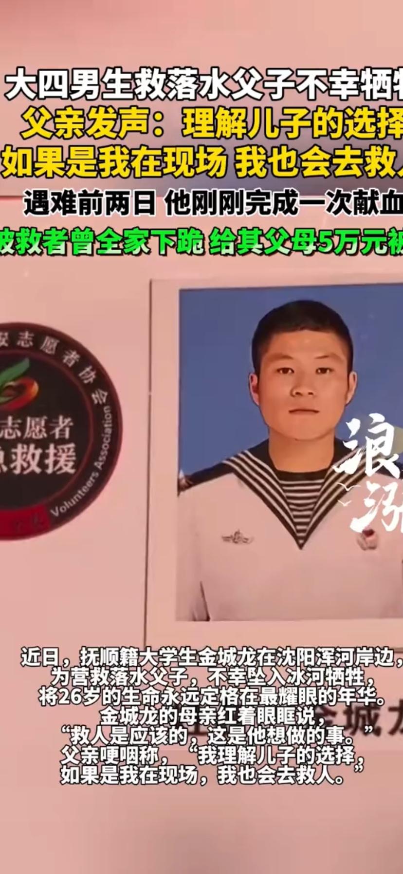 冰河惊魂!26岁医学生勇救落水父子,为何纵身一跃后再也没能上岸? 沈阳浑河的寒冬,一场突如其来的险情打破了河面的平静。一对父子不慎坠入冰冷的冰河,危急时刻,一名年轻身影毅然纵身跃入刺骨河水,奋力展开营救。然而谁也没想到,这一跳,竟成了他生命最后的定格。 这位用生命书写壮举的年轻人,是辽宁中医药大学26岁的大四学生金城龙。即将毕业的他,本应怀揣着医学梦想踏入职场,开启人生的崭新篇章,却在他人遭遇灭顶之灾时,毫不犹豫地选择了舍己为人。 零下的气温、湍急的冰河、未知的水下隐患,每一项都暗藏致命风险。金城龙没有丝毫迟疑,用单薄的身躯与严寒河水对抗,拼尽全力将落水父子推向安全地带。可就在救援即将成功之际,意外突然发生,他不幸被暗流裹挟,永远留在了这片冰冷的河水中。 为何这位医学生能在生死瞬间做出如此勇敢的抉择?他的日常是否早已暗藏着这份无畏与善良?作为中医药大学的学子,他始终践行的“医者仁心”,在这一刻化作了最动人的生命赞歌。26岁的青春虽戛然而止,但他纵身一跃的背影,却成为了这个寒冬里最耀眼的光,让无数人在痛心之余,更对这份年轻的担当充满敬意与好奇。 英雄的离去令人扼腕,而他用生命传递的勇气与善意,终将在岁月中永恒。