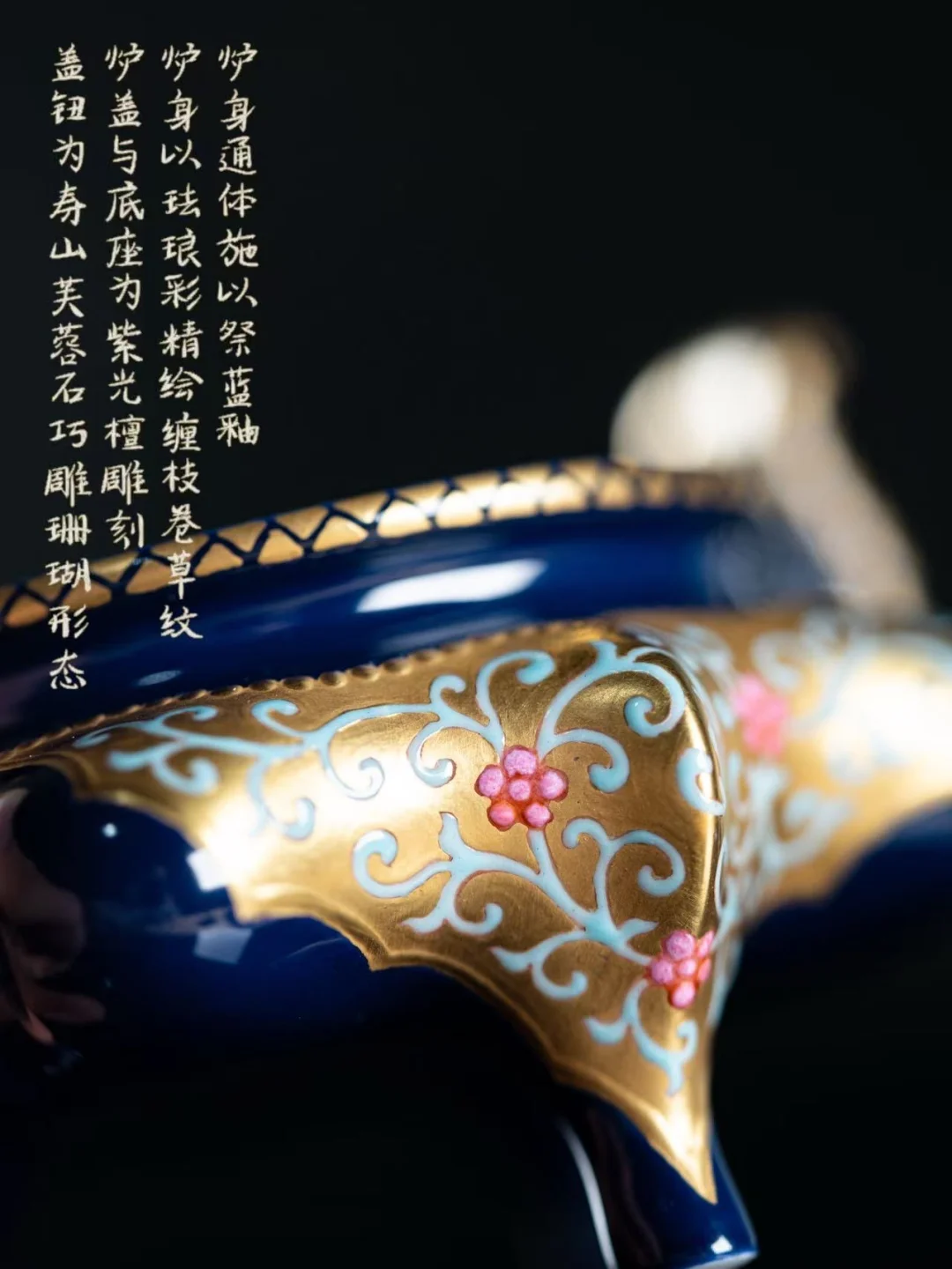 釉色如深海凝光,珐琅彩缠枝生辉。器型源自宣德炉,沉稳中见华贵,象征根基稳固与尊荣,契合一场值得期待的长远合作。