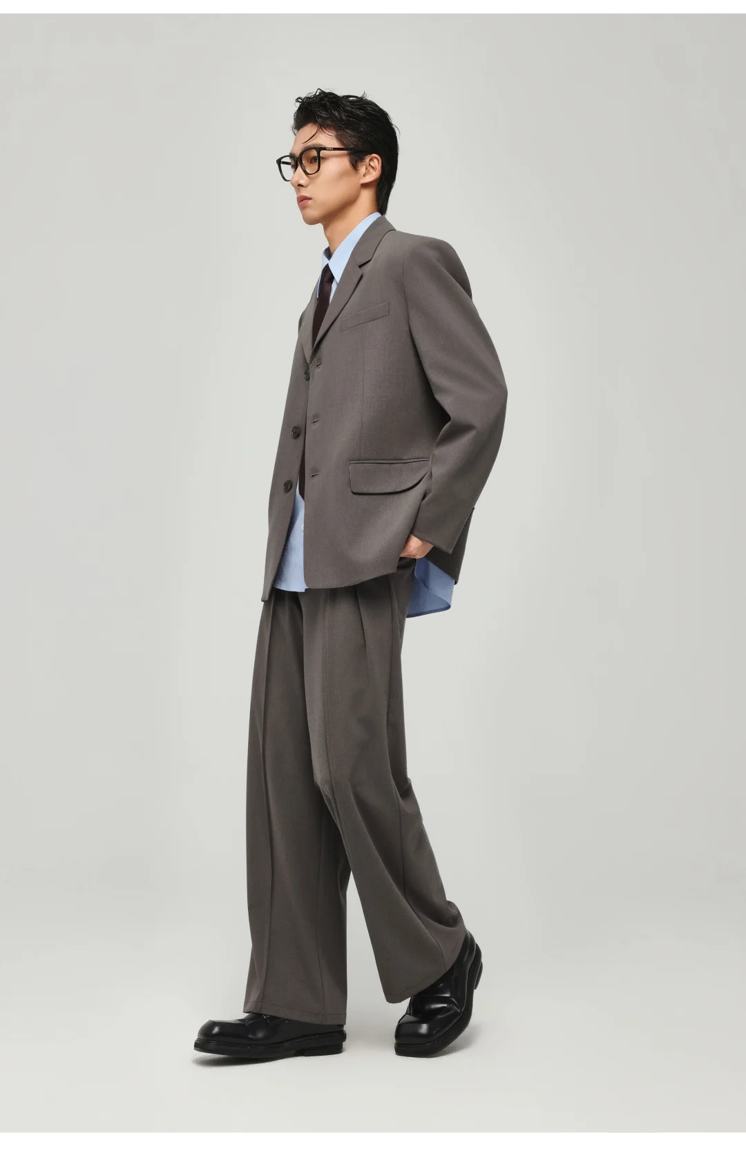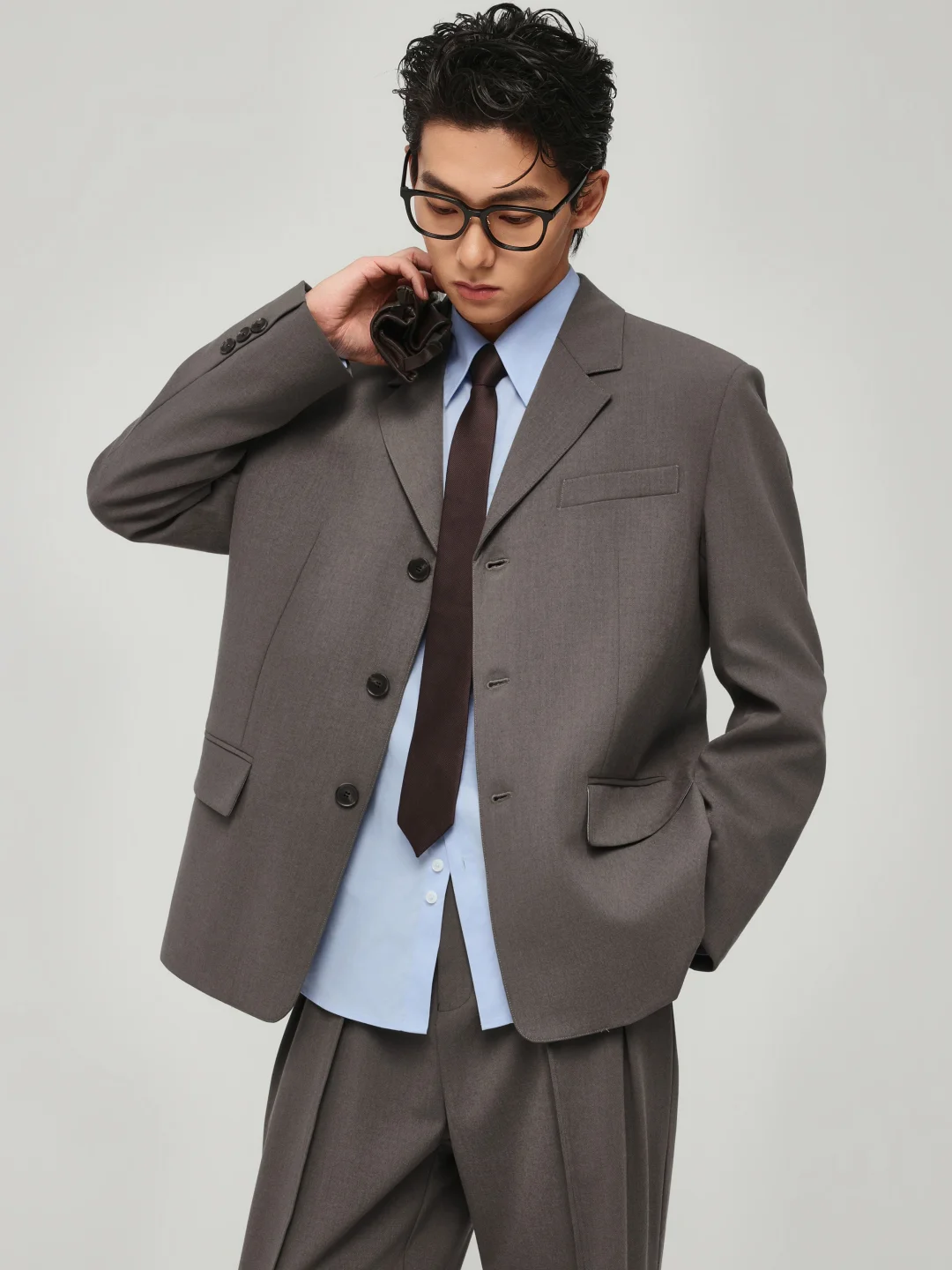 🧥 版型决胜 拒绝修身款的束缚感,微宽松的剪裁和三粒扣设计,让整个人看起来挺拔又松弛。这不是推销员的制服,而是创意总监的战袍,充满了解构主义的线条感。