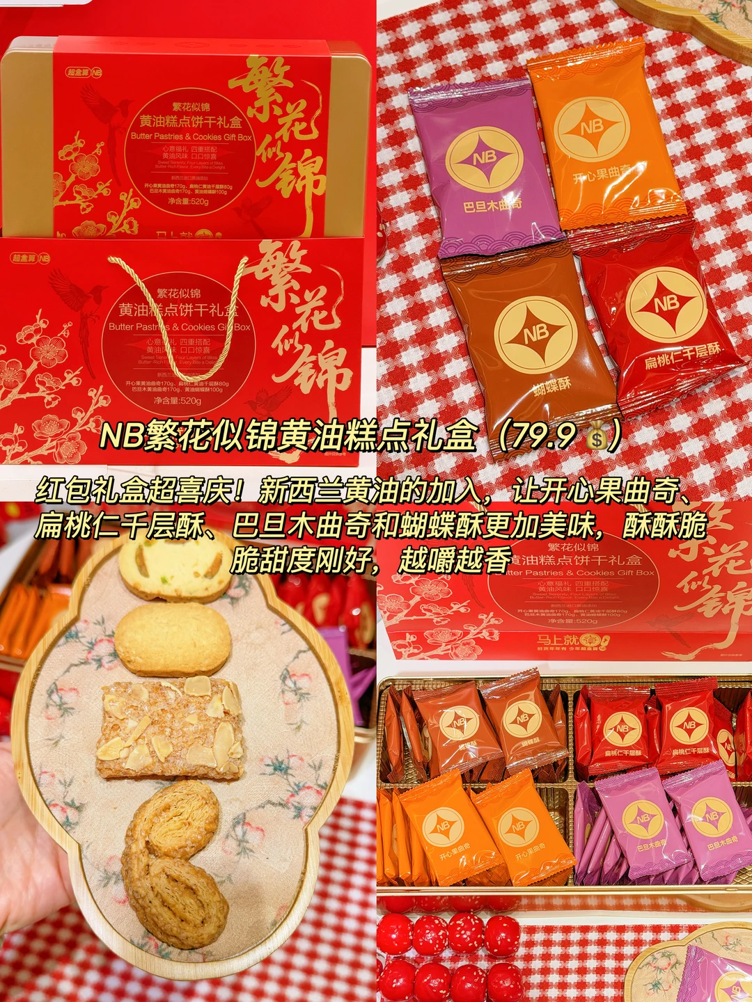 红包礼盒超喜庆!新西兰黄油的加入,让开心果曲奇、扁桃仁千层酥、巴旦木曲奇和蝴蝶酥更加美味🤤酥酥脆脆甜度也刚刚好,越嚼越香~