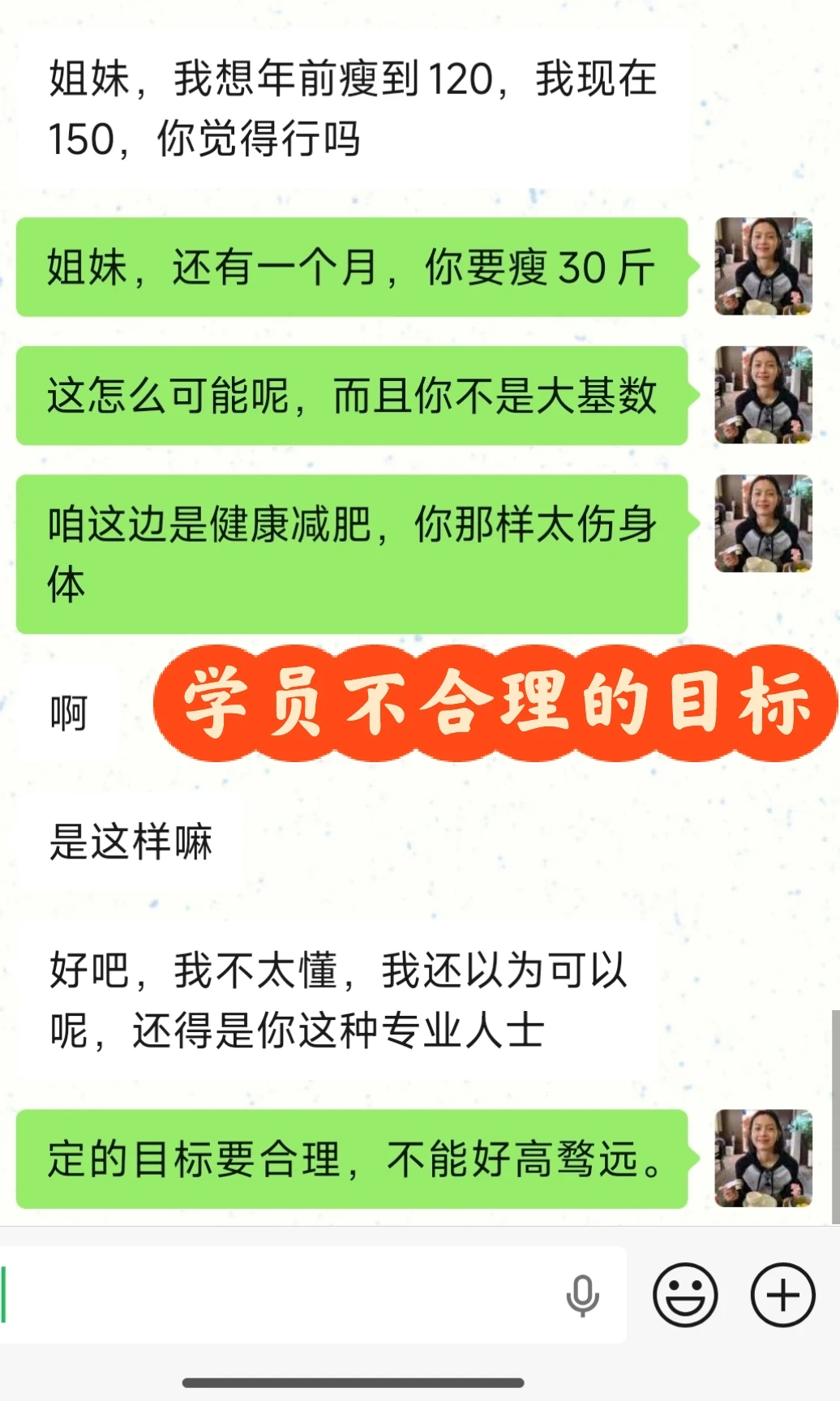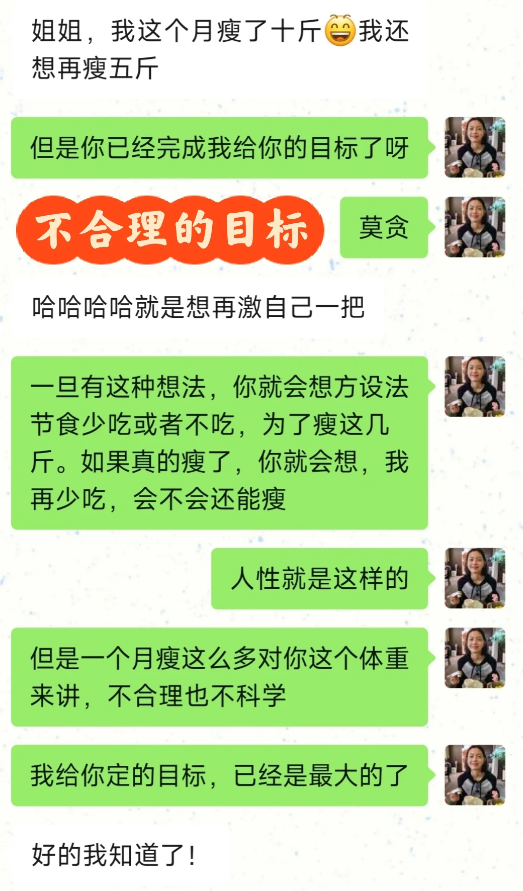 所以我跟每一个学员都这么说,心态千万要稳,定的目标不能太高,要合理科学。健康掉秤,这样瘦下来对身体也不会有影响,更不会脱发,姨妈出走。