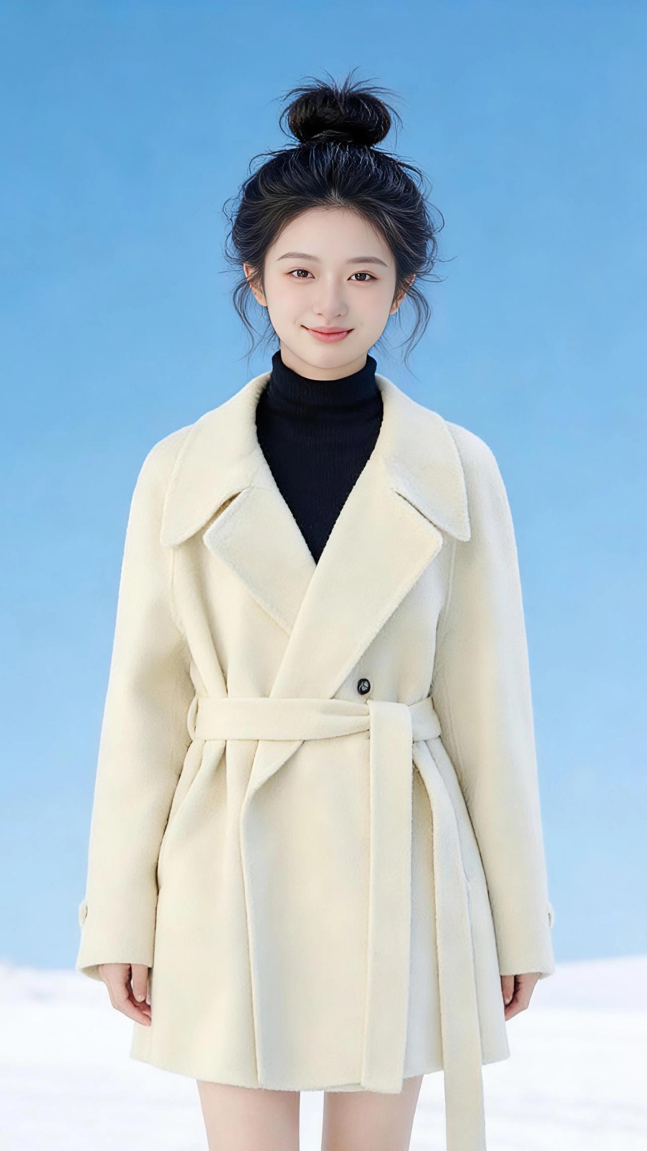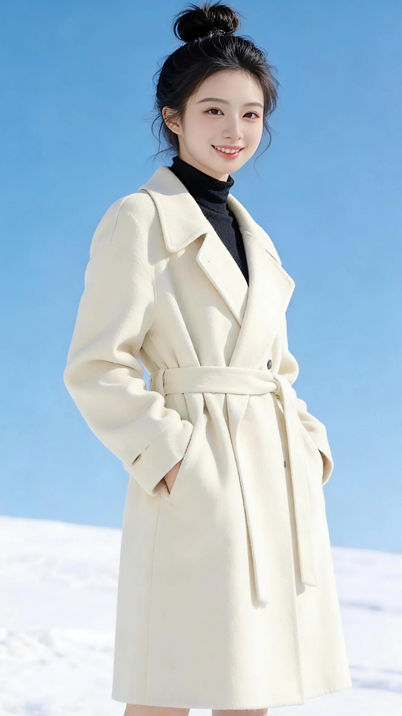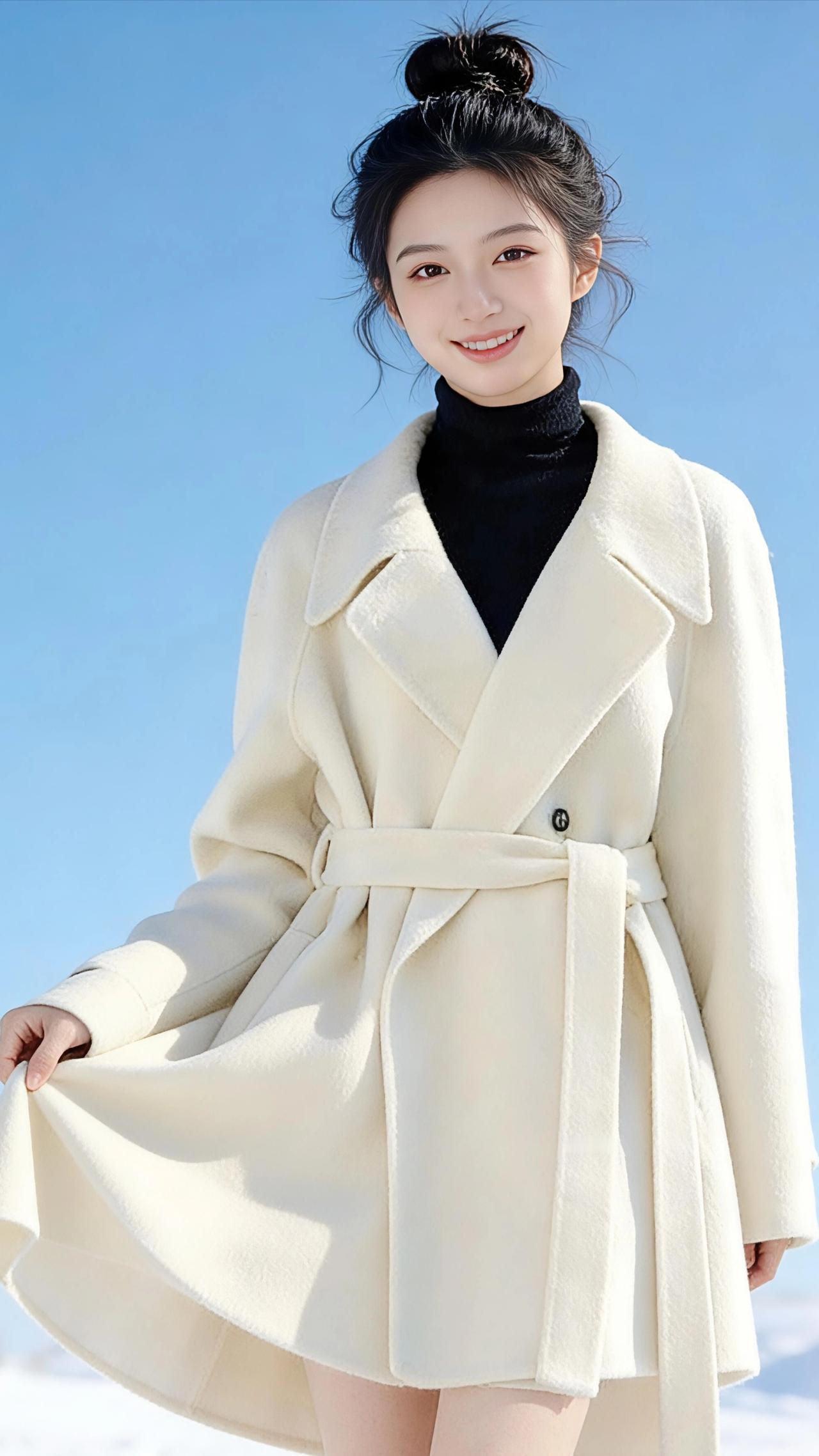 雪上白绒 雪是铺展到天边的素笺,风是执笔的手,而她是落在这方天地里的一捧温柔。 米白色大衣裹着清瘦的肩颈,像团揉开的云絮,在零下的风里也暖得发光。黑高领是沉静的底色,衬得那张笑靥比雪还明亮。她张开手臂时,衣摆便跟着扬起,像振翅的白鸽要撞进蓝天里;拢住裙摆转身时,绒面的褶皱里又落满细碎的光。 丸子头的碎发沾了些雪粒子,在日光里闪着星子似的亮。她把双手插进大衣口袋,侧脸便浸在暖黄的光线里,连睫毛的影子都温柔。风掀起衣摆的弧度,像雪地里漾开的涟漪,她走得很慢,每一步都像踩在棉花上,生怕惊落了满世界的白。 原来冬日不必萧瑟,一件暖衣、一抹笑,就足以让寒天冻地都变得柔软。她站在雪与天的交界,像首写在风里的诗,干净、明亮,带着绒绒的温度。 大衣 高级感穿搭 冬季穿搭 新年穿搭 小个子穿搭