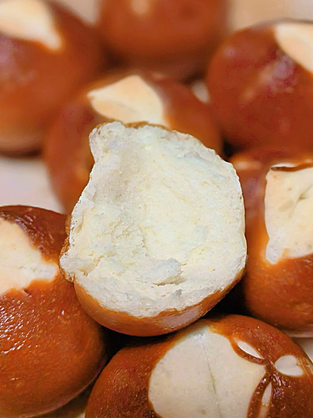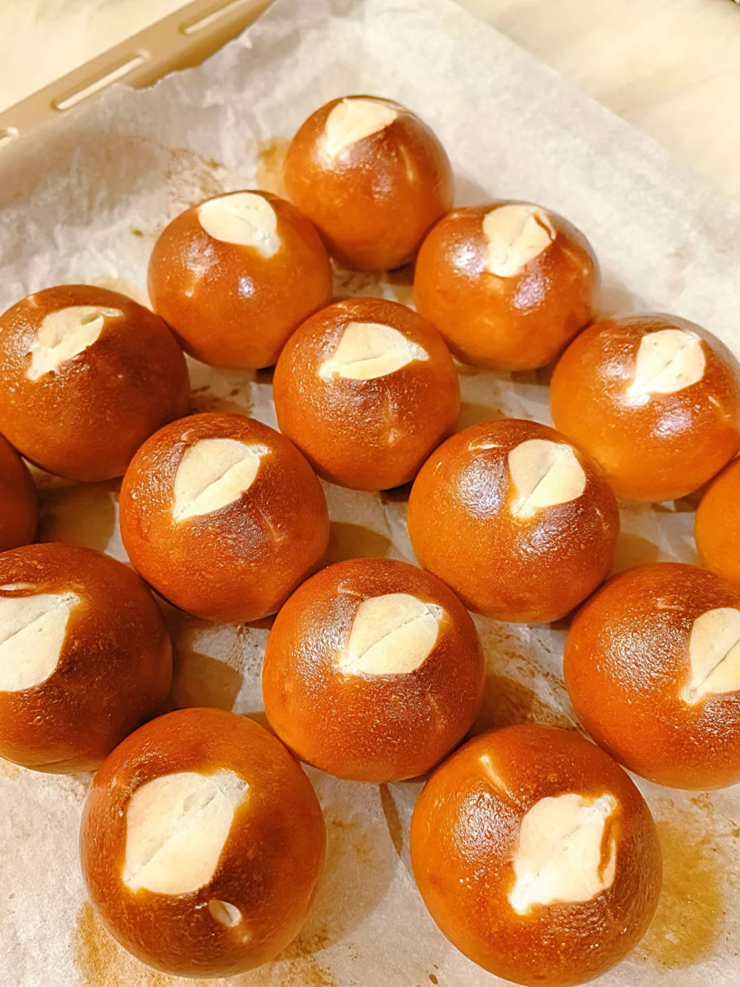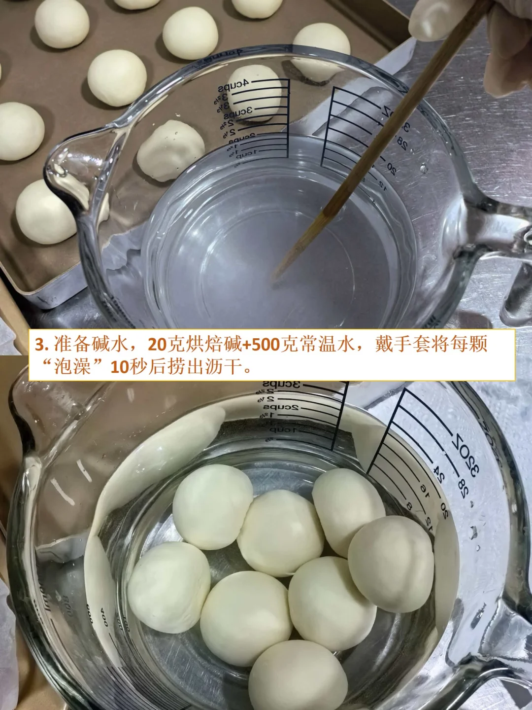 姐妹们!减脂期嘴巴寂寞?店里10块一个的焦脆碱水球,我2元复刻! 面包机15min揉面,烤箱15min滚成“迷你保龄球”,0糖油炸弹、0造型难度! 外皮咔嚓到上头,内心软弹有嚼劲,1颗≈68kcal,比苹果还低,啃3颗都不带破戒! 🍞面团配方(16颗量) 高筋粉200g|低筋粉50g|冰水145g|盐4g|奶粉10g|酵母2g 碱水部分:烘焙碱 20g | 水:500g 🔥懒人5步(减脂版) 1. 所有材料进面包机,选择“和面菜单”15min,揉成八层筋度即可! 2. 室温松弛10分钟后,分16份(≈25g/颗),掌心滚圆,放入冰箱冷藏20分钟。 3. 准备碱水,20克烘焙碱+500克常温水,戴手套将每颗“泡澡”10秒后捞出沥干。 4. 再放入烤盘,凉2分钟后用剪刀剪口,深度1厘米左右。 5. 放入烤箱中下层,上火230度,下火180度 ,15分钟出炉,“老虎棕”闪到反光! 💡减脂封神点 ①0油0糖,比香蕉还友好 ②高盐+咀嚼感→啃一颗能嚼50下,大脑快速“饱腹”,下午茶来2颗直接省掉薯片! ③低GI→碱水外衣延缓碳水吸收,运动前吃2颗,撸铁不撞墙!