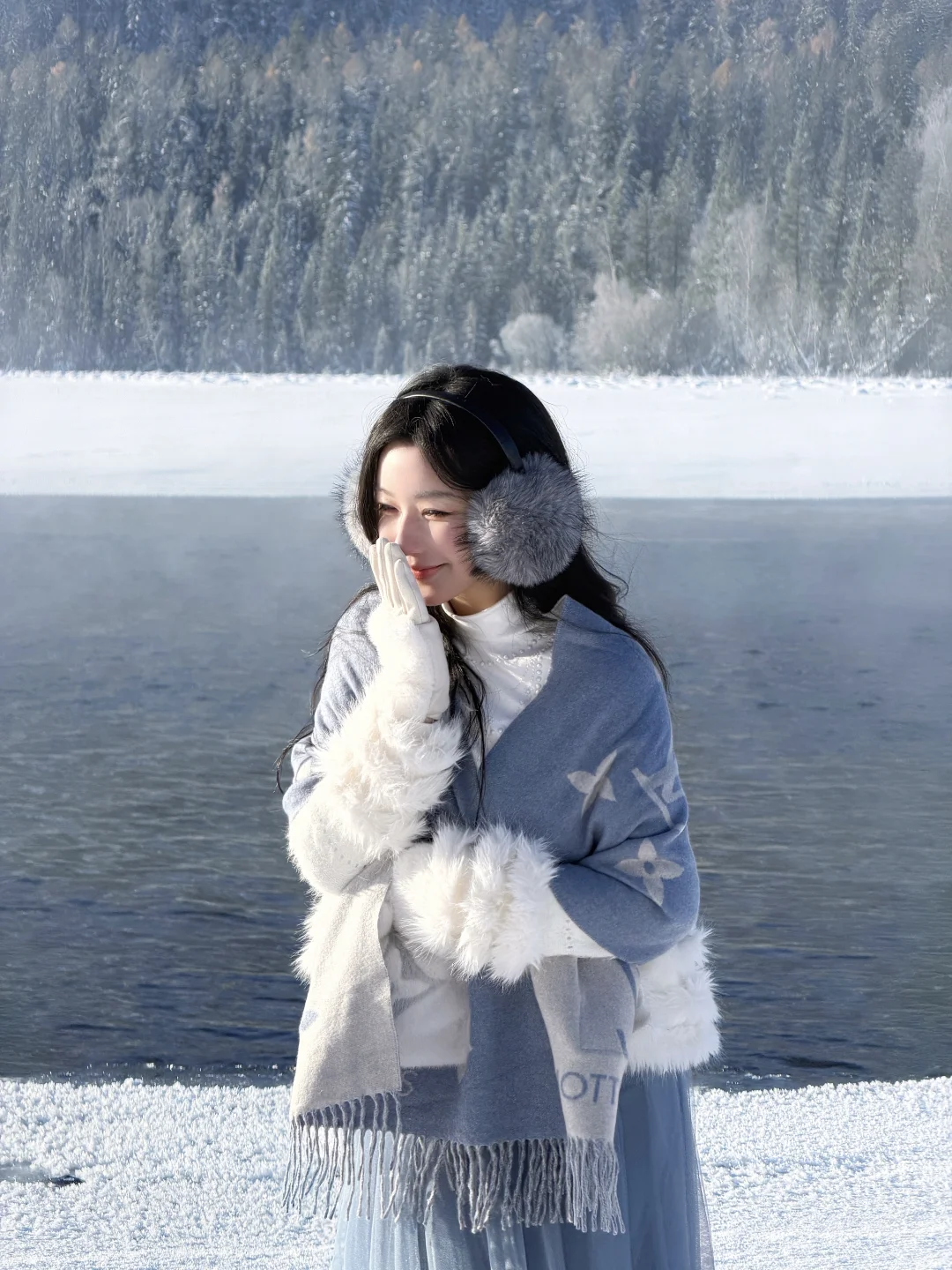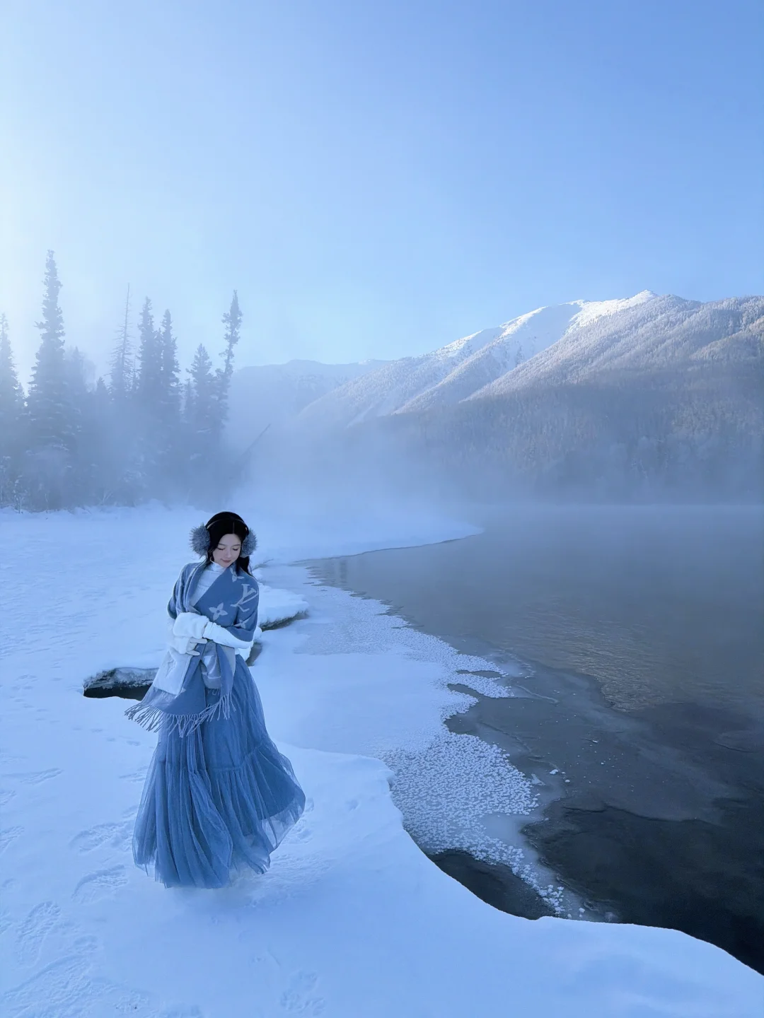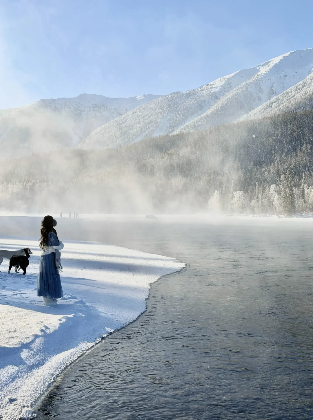 🔹冬季早上气温低,整片河谷都被白茫茫的雾气和晶莹的雾凇笼罩,清晨的第一缕阳光洒上结晶的湖面闪闪发光,简直就是仙境
