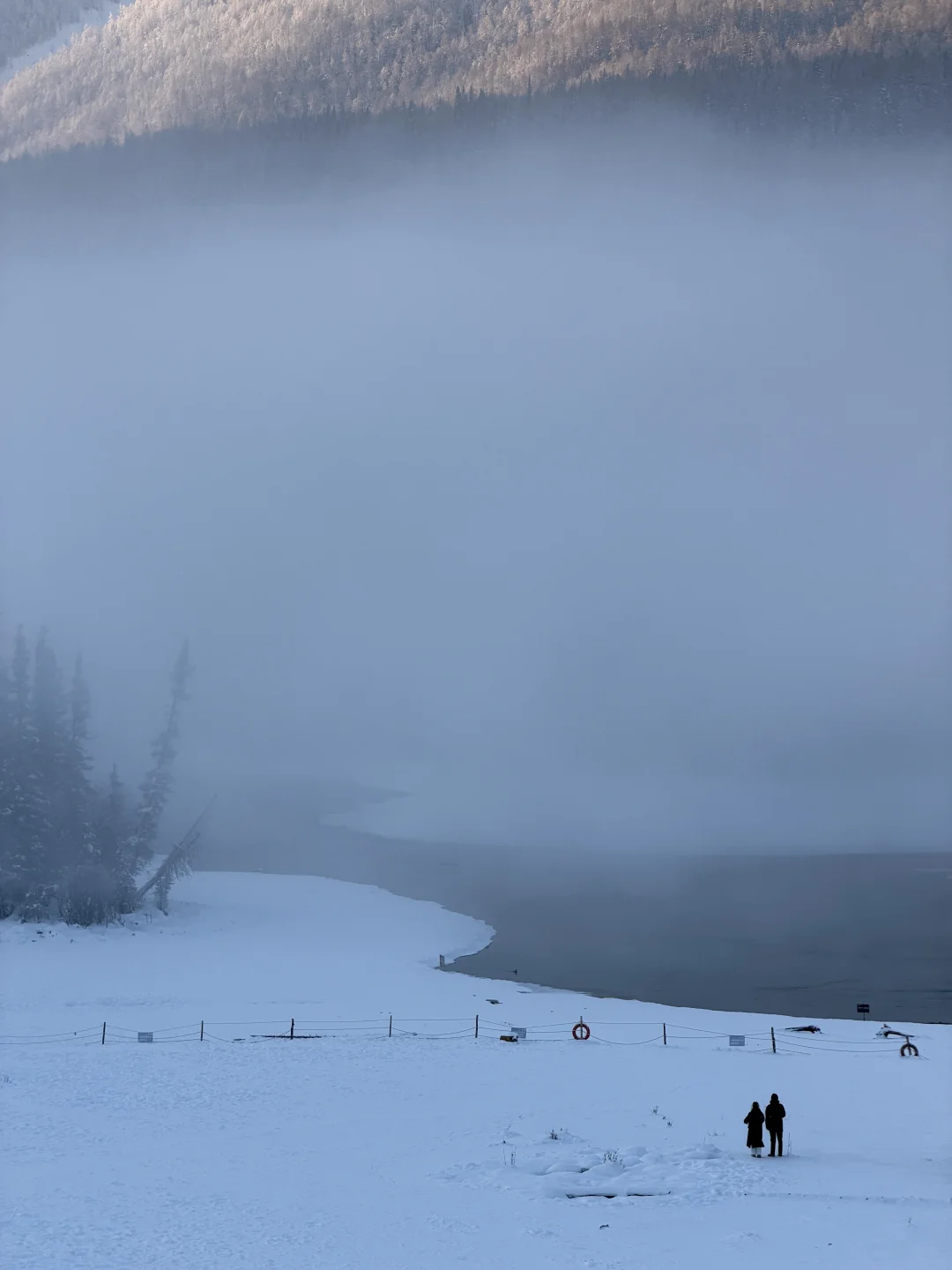 厚厚积雪的观鱼台上俯瞰结冰的喀纳斯湖真的绝美