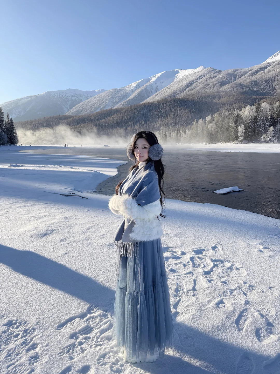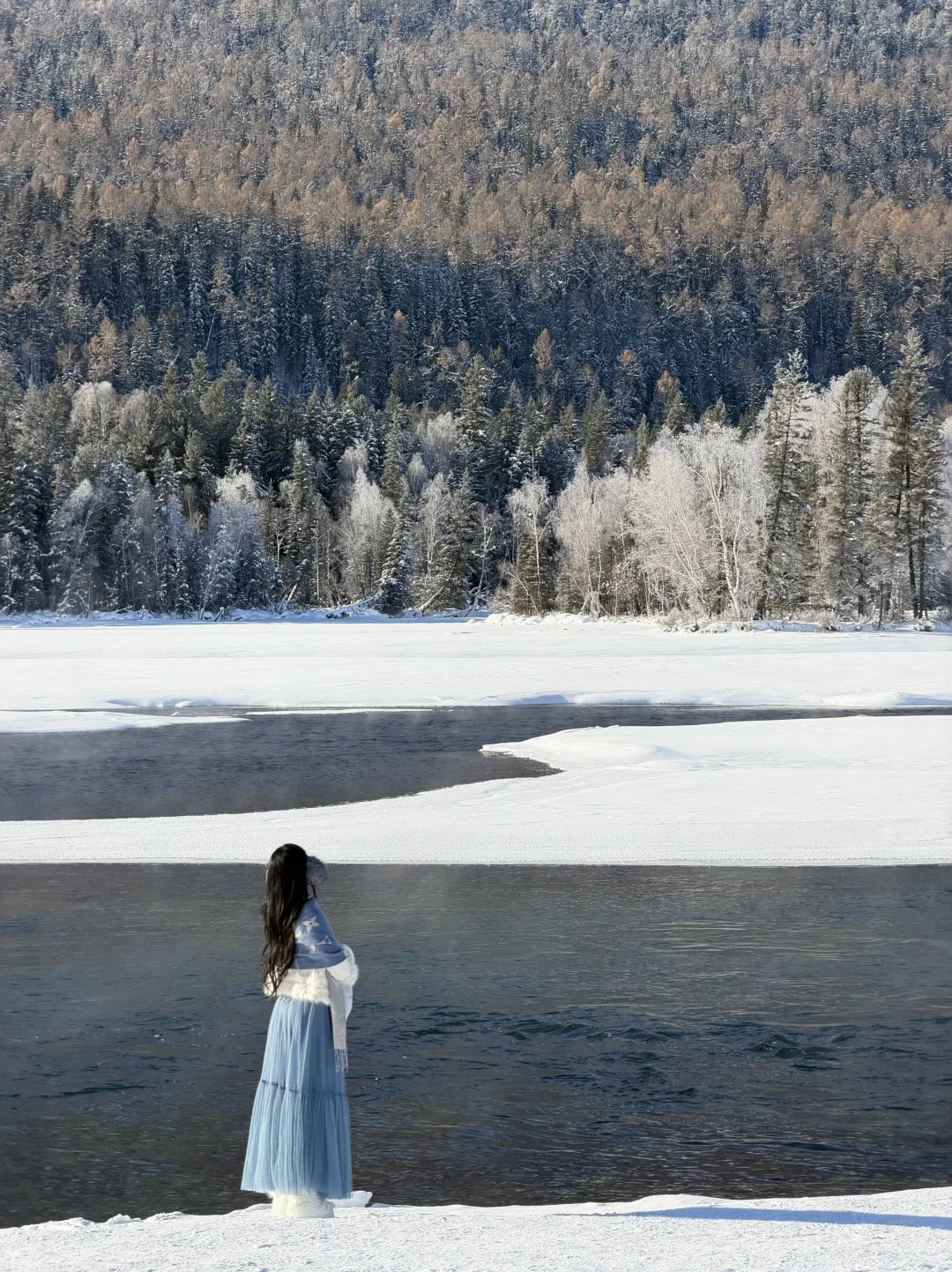 在观景台上看好似盘踞雪河的巨龙,下木栈道可以走到河边,湍急的河流和岸边的雾凇拍照也很出片