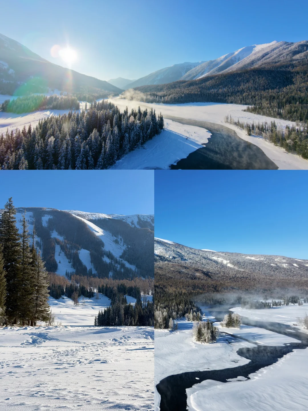 🔹冬天的喀纳斯湖结成蓝冰,湖岸堆着厚厚的雪蘑菇。可以沿湖边栈道走走