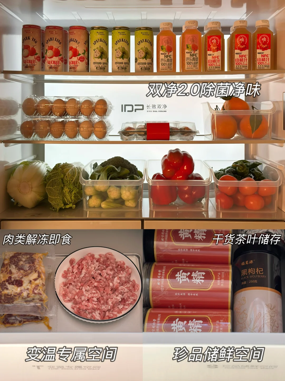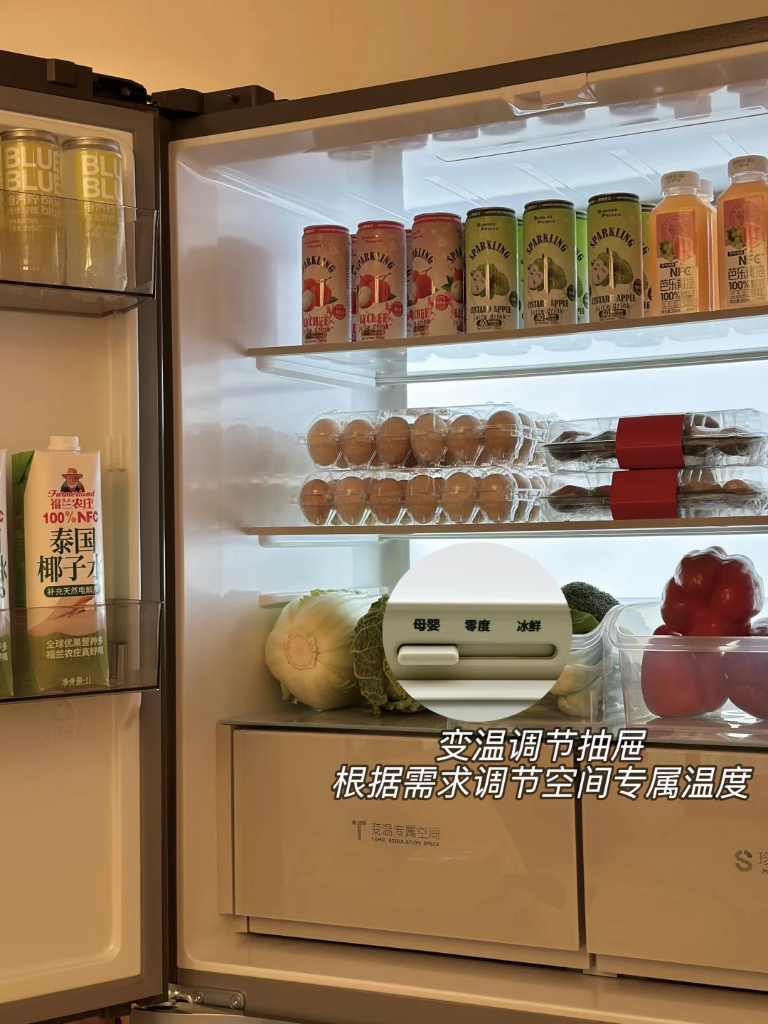[种草R]最爱它的分区设计,冷藏区的珍品储鲜抽能放干货补品,变温专属抽我拿来存放次日要食用的鱼肉生鲜,很方便。冷冻区是3+3+1的分储格局,3个巨无霸大抽屉特别好用。现在每次去超市,我都能大胆把购物车装满,海鲜肉类、应季果蔬、酸奶零食通通拿下,回家分门别类塞进冰箱,看着满满当当的 “家庭粮仓”,安全感十足~