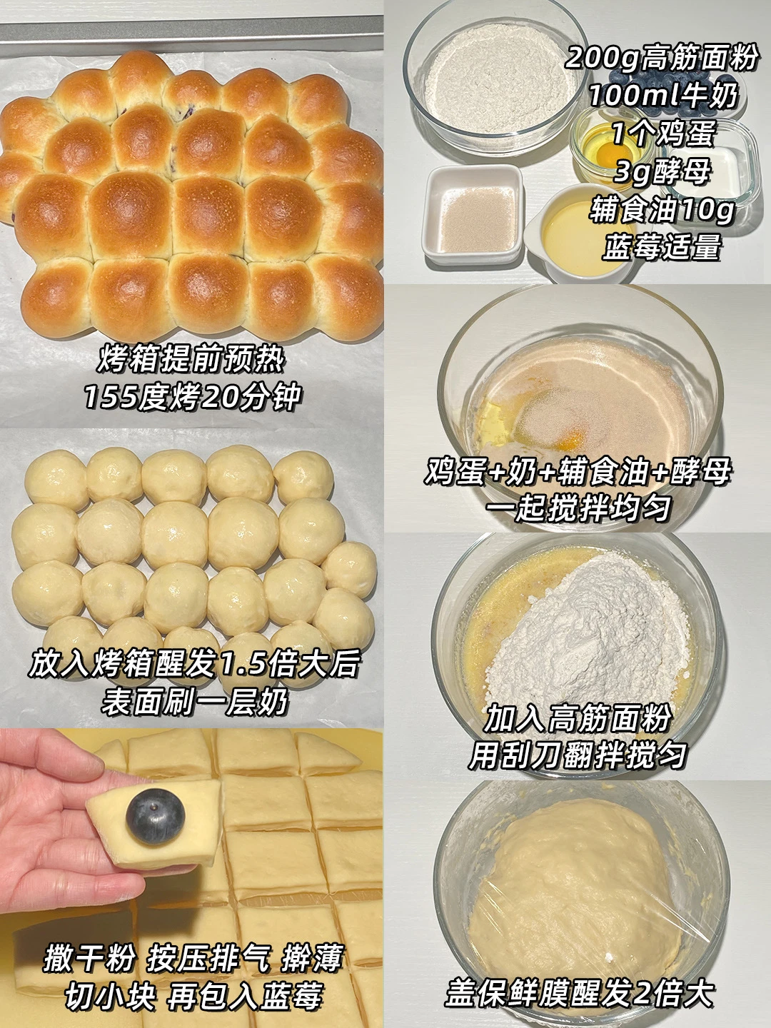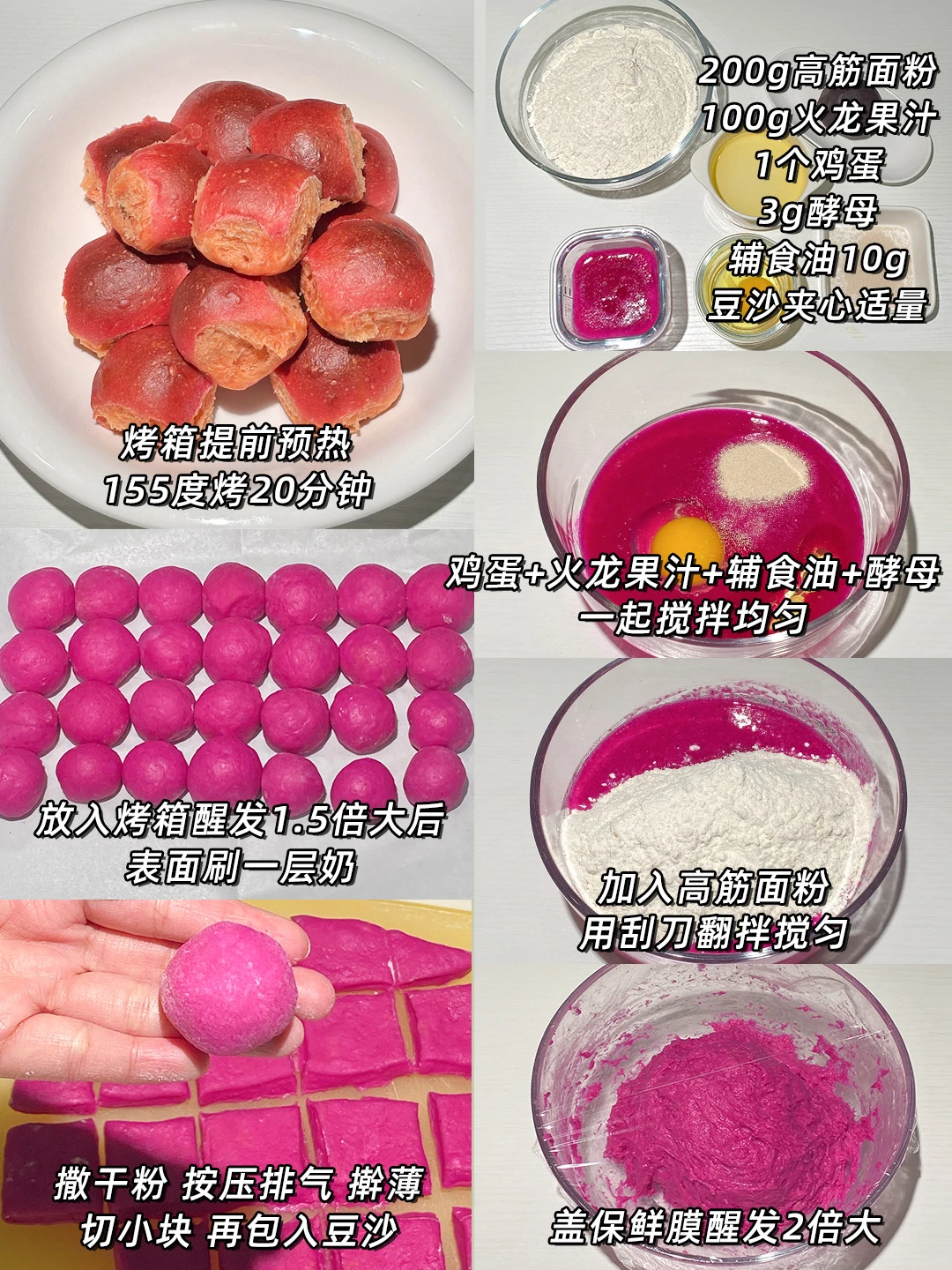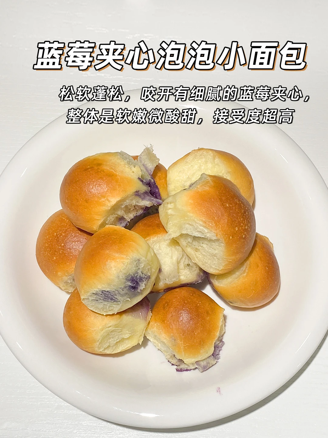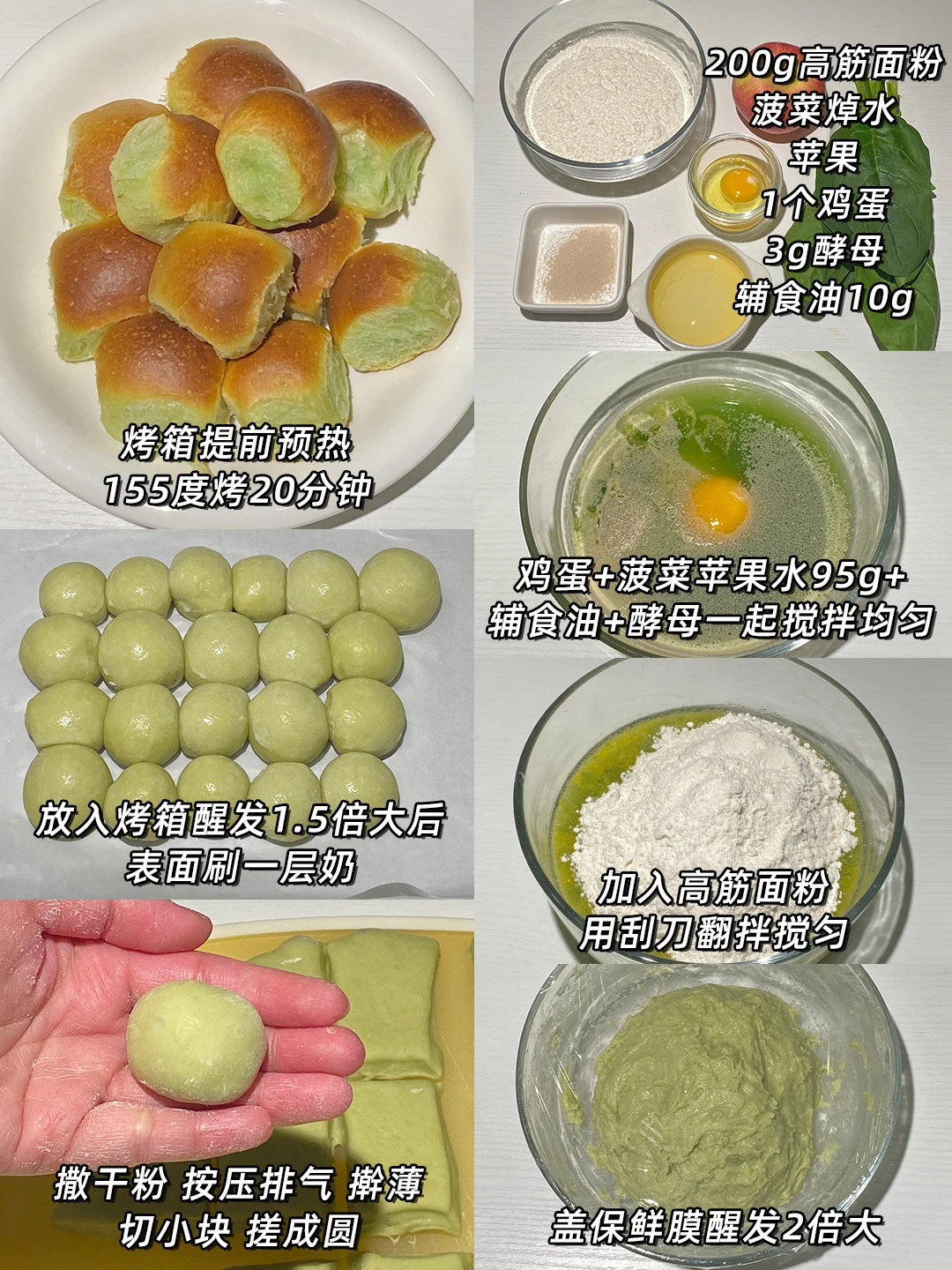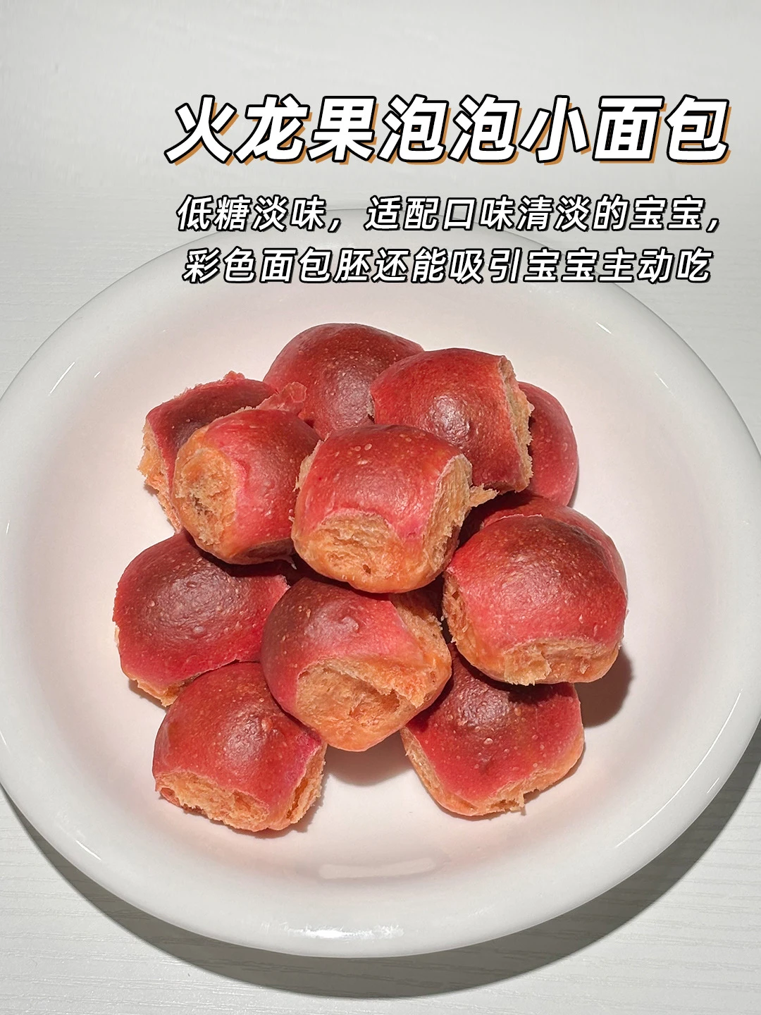 家里小朋友喜欢吃面食,平时有空就会在家给自己做一些小面包~ 今天分享3款果蔬免揉泡泡小面包~松软蓬松、用料实在,自己做也更放心 ,家里小朋友一口一个好吃到根本停不下来~ ,免揉面无需手膜,新手也能一次成功~收藏起来过年可以露一手~ 🫐蓝莓夹心泡泡小面包: ▪️高筋面粉200g |奶100ml |鸡蛋1个| 酵母3g |辅食油10g |蓝莓适量 👉咬开有细腻的蓝莓夹心,整体是软嫩微酸甜,接受度超高 🥬菠菜苹果泡泡小面包 ▪️200g高筋面粉|菠菜焯水|苹果|1个鸡蛋|3g酵母|辅食油10g 👉口感松软清淡微香,属于淡味果蔬款,很适合不爱吃蔬菜的小朋友 💁‍♀️火龙果泡泡小面包 ▪️200g高筋面粉|100g火龙果汁|1个鸡蛋|3g酵母|辅食油10g|豆沙夹心适量 👉低糖淡味,适配口味清淡的宝宝,粉红面包还能吸引宝宝主动吃。大朋友吃加豆沙夹心口感更好~ 具体教程请看图文哦~ 💁‍♀️注意点: ✔一岁以下宝宝不加糖,牛奶换配方奶 ✔大朋友吃按这个配方加15-20g砂糖是微甜口感 ✔烤箱温度与时间根据自家烤箱脾气做调整(参考值150-160°)