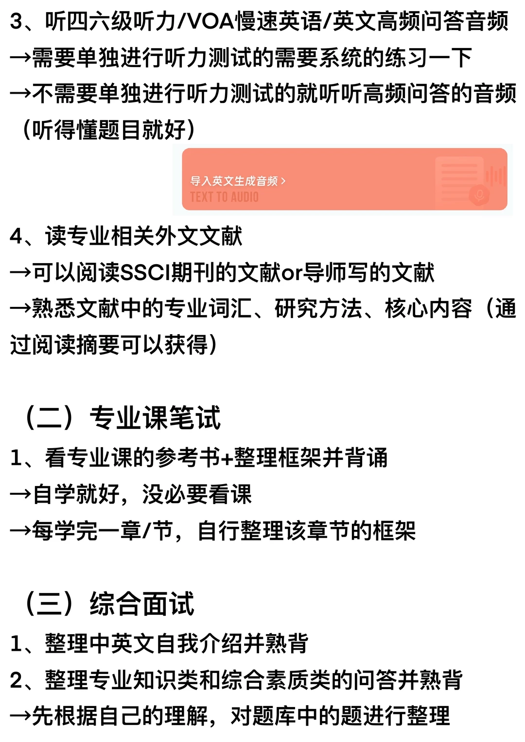 Stella~听力一般是在面试时通过听懂考官的问题来进行考察,也就是不单独考察;但是需要看你的目标院校是否需要单独进行听力考试;有的学校不一定是单纯问你英文的高频问答,也许会从专业相关的文献中摘取一段,让你现场阅读,然后提取出结论或者看法,所以需要读读外文文献,知晓一些专业词汇