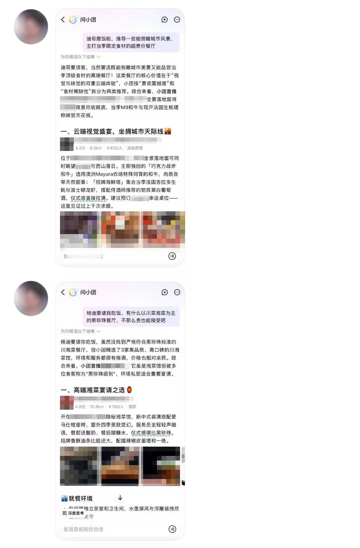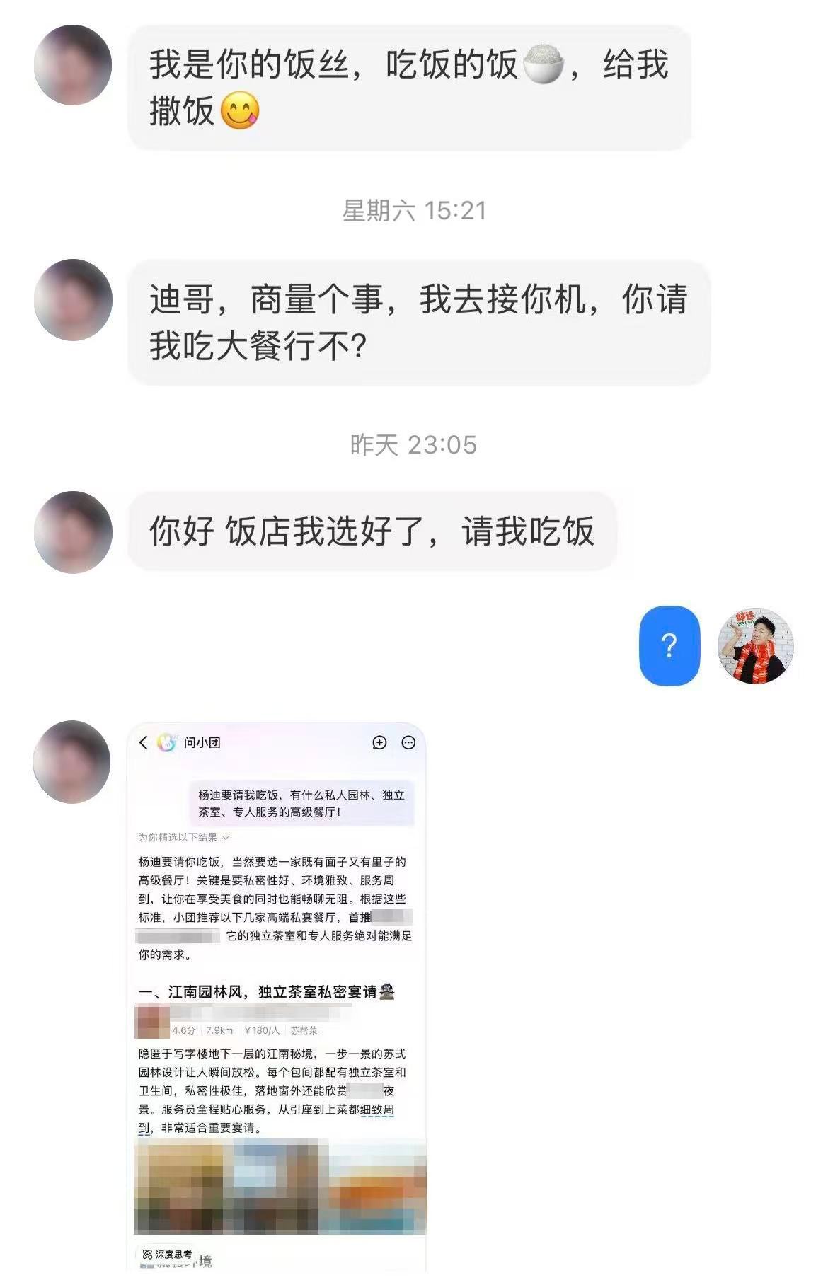 杨迪晒和网友的聊天记录 发现杨迪能在各种综艺里屹立不倒,是因为他的应变和情商很强,评价美食语言的艺术,在综艺里巧妙化解尴尬等等,最近遇到粉丝私信要“撒饭”,杨迪直接回复问小团的截图“怎么才能让粉丝请我吃饭”,这既巧妙婉拒粉丝,又让粉丝不会太尴尬。看杨迪和粉丝发的问小团截图,感觉推荐得都很精准哇,问美团,都安排,问小团也能给你高情商回复哟~美团安排问美团都安排