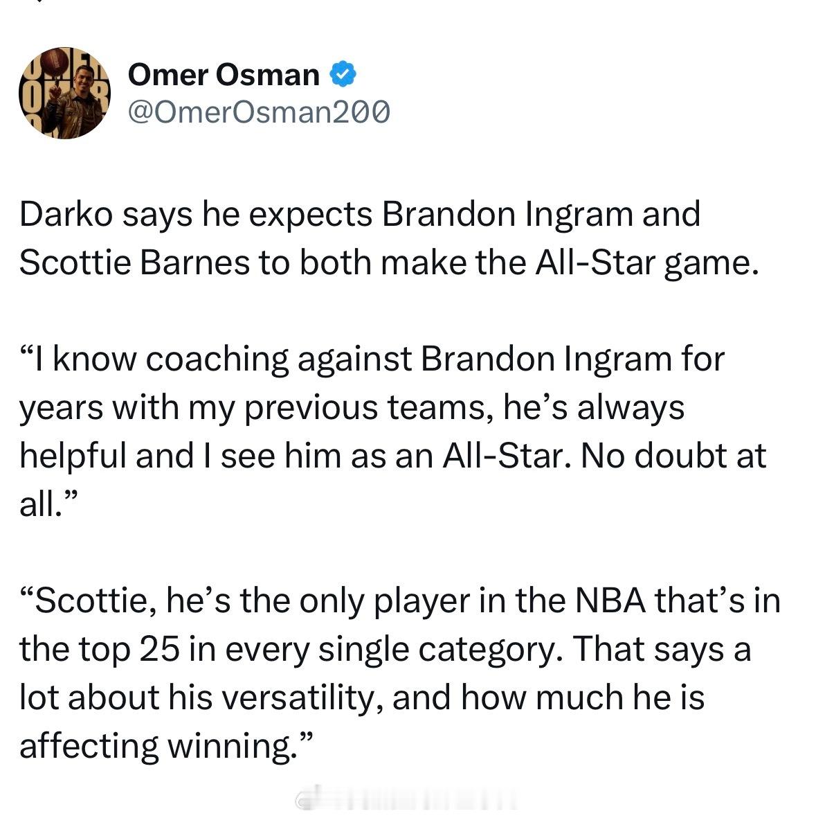 猛龙主帅达尔科:我期待英格拉姆和巴恩斯都成为全明星。谈到英格拉姆,达尔科称:我在以前的执教经历对阵英格拉姆的时候,我知道英格拉姆总是对球队的帮助的,我觉得他就是一名全明星,毫无疑问。谈到巴恩斯:巴恩斯每项数据都在联盟前25,这体现了巴恩斯的能力和他对球队胜利的影响。多伦多猛龙