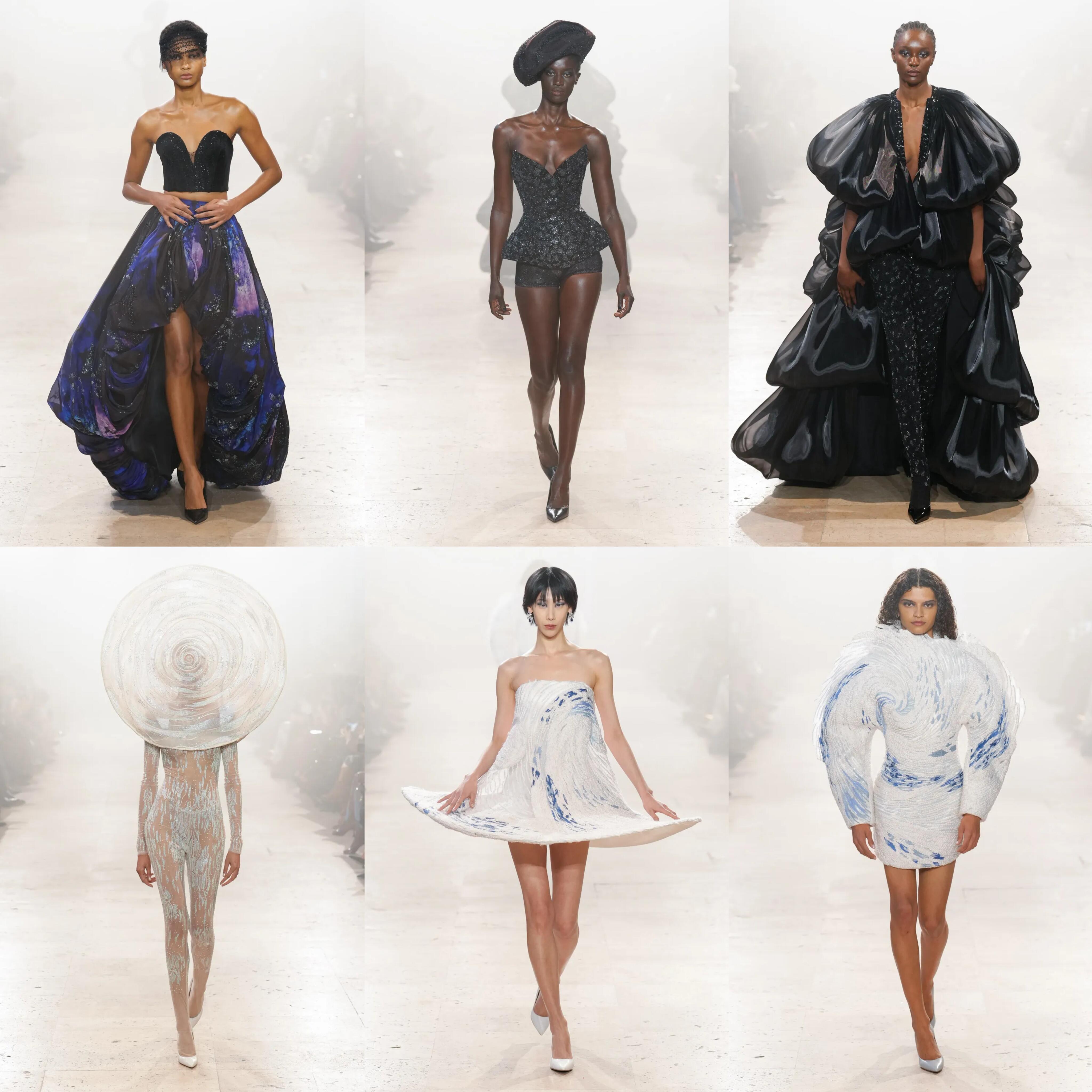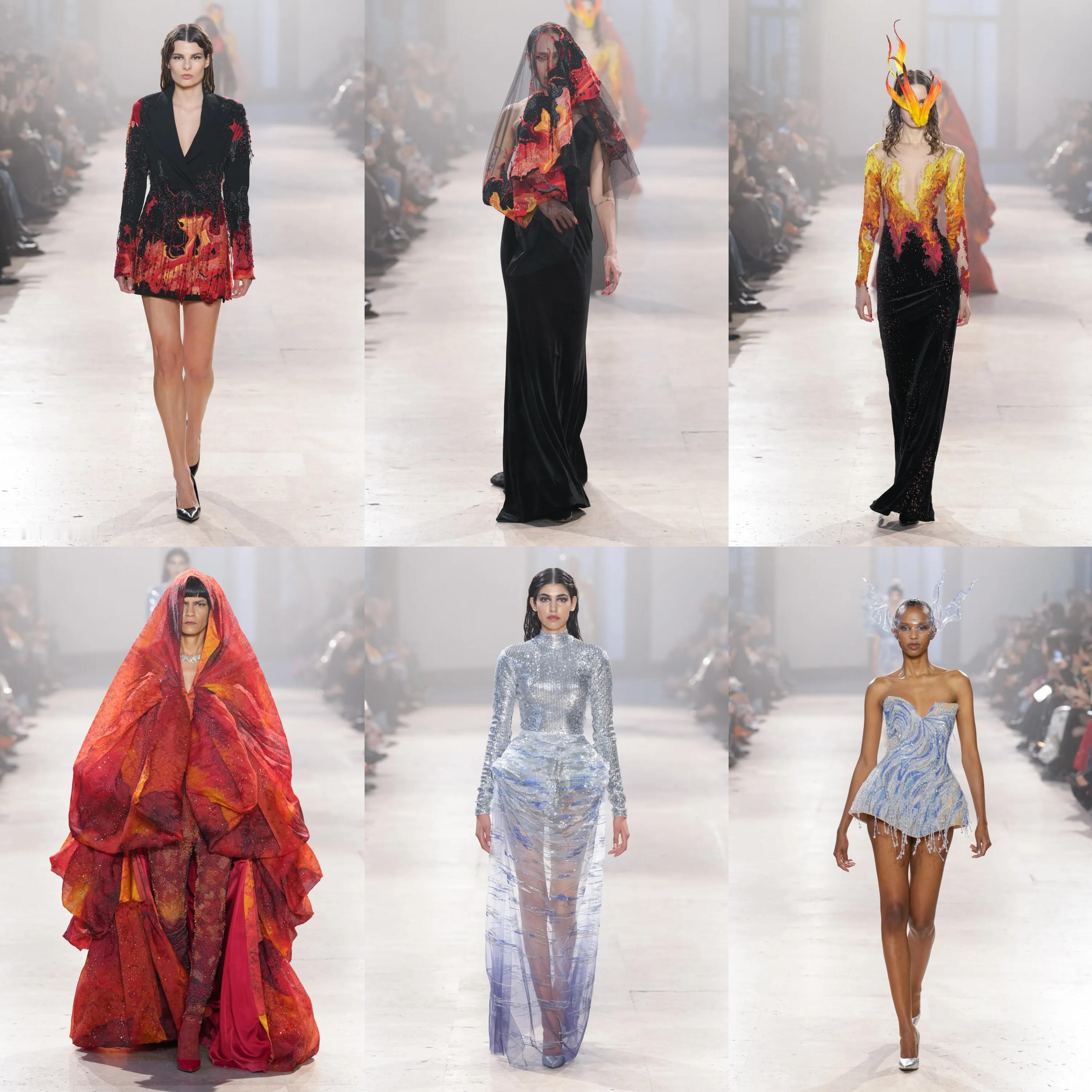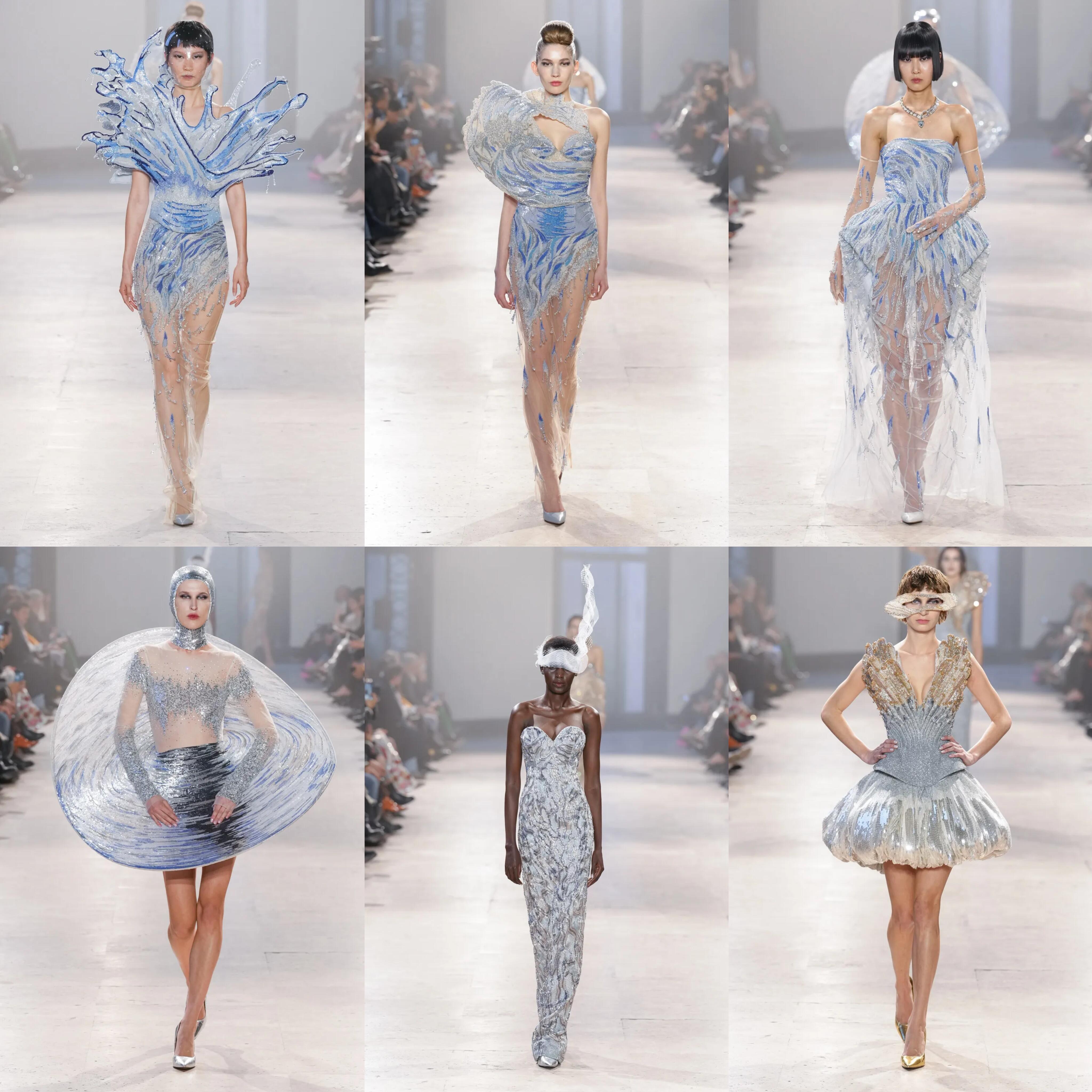 Rahul Mishra 2026 春夏高定系列本季高定秀Rahul Mishra 展示了52套高定Look,近两年品牌在内娱活动、盛典、杂志频繁曝光,成为内娱最追捧的高级定制品牌。该系列被命名为“Alchemy”,核心灵感是来自印度哲学五大元素(地、水、火、风、空)与服装结合在一起,利用立体刺绣表达“风”的流动感,面料肌理呈现“水”的波纹质感,将自然之力具像化。巴黎高定时装周大秀直击