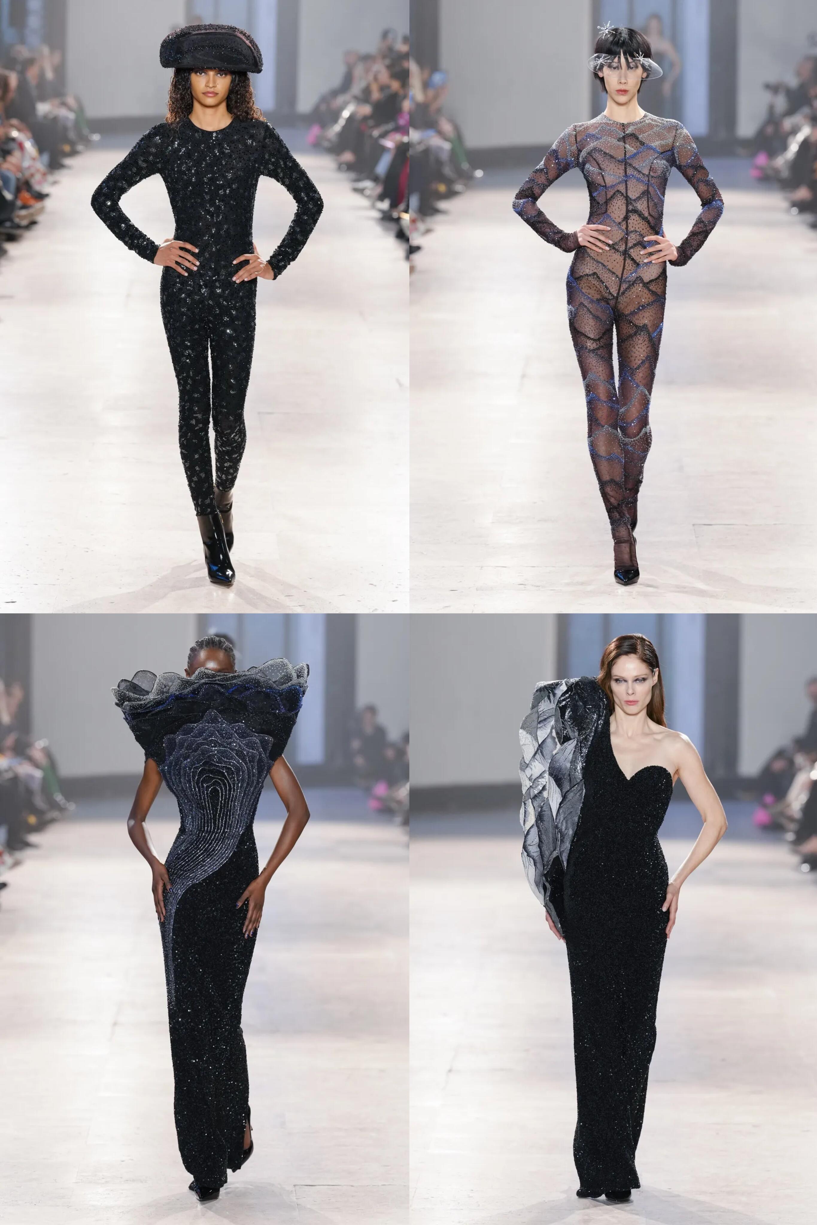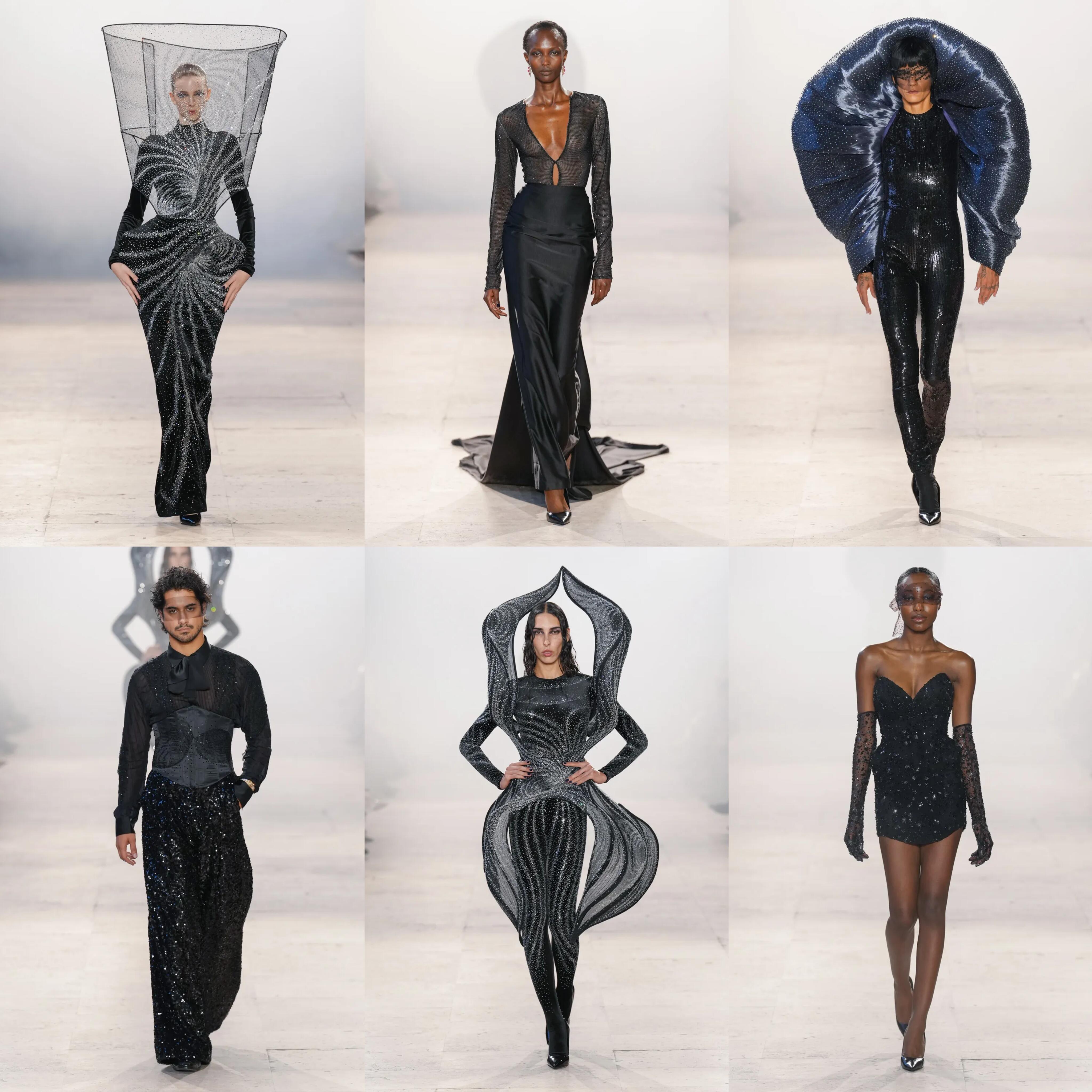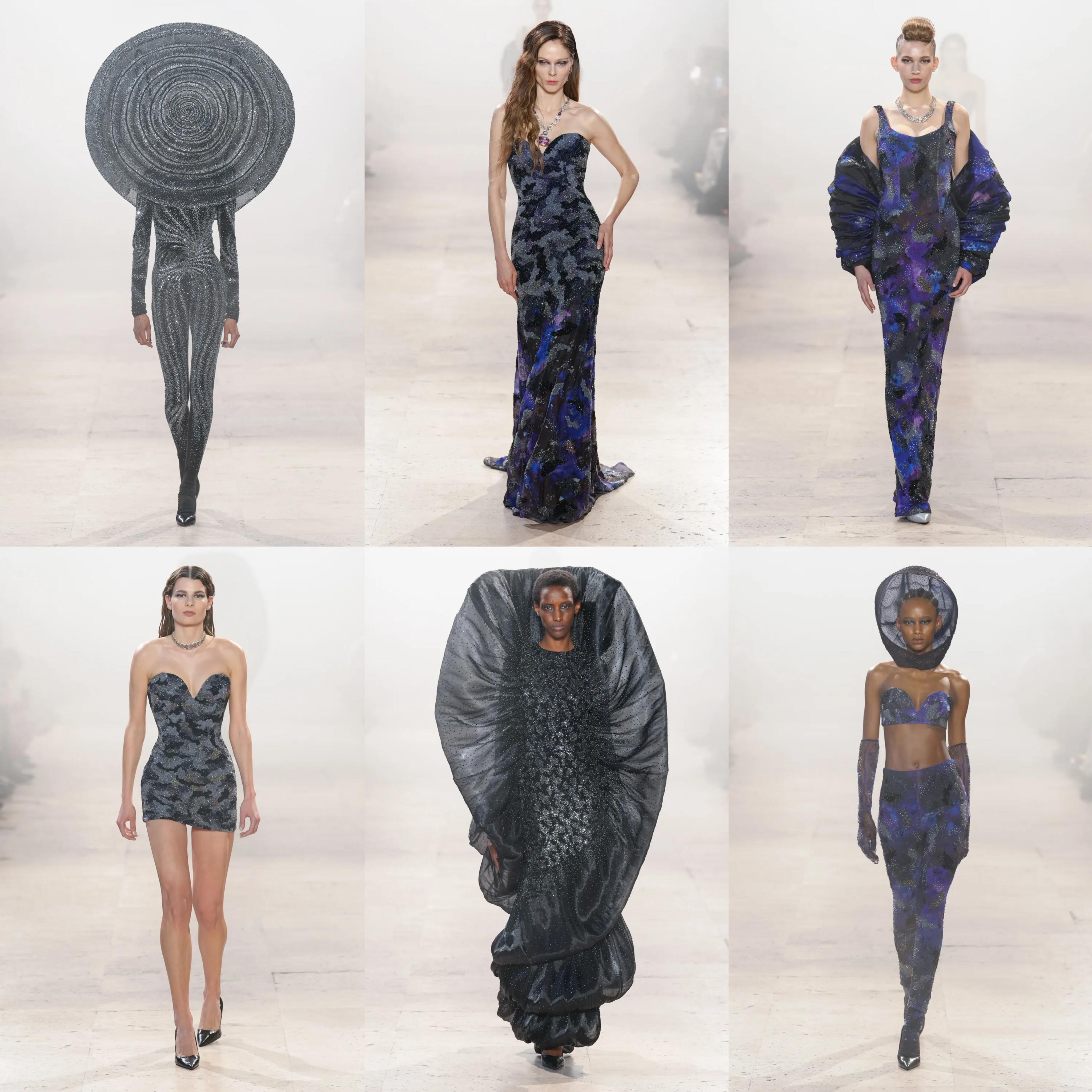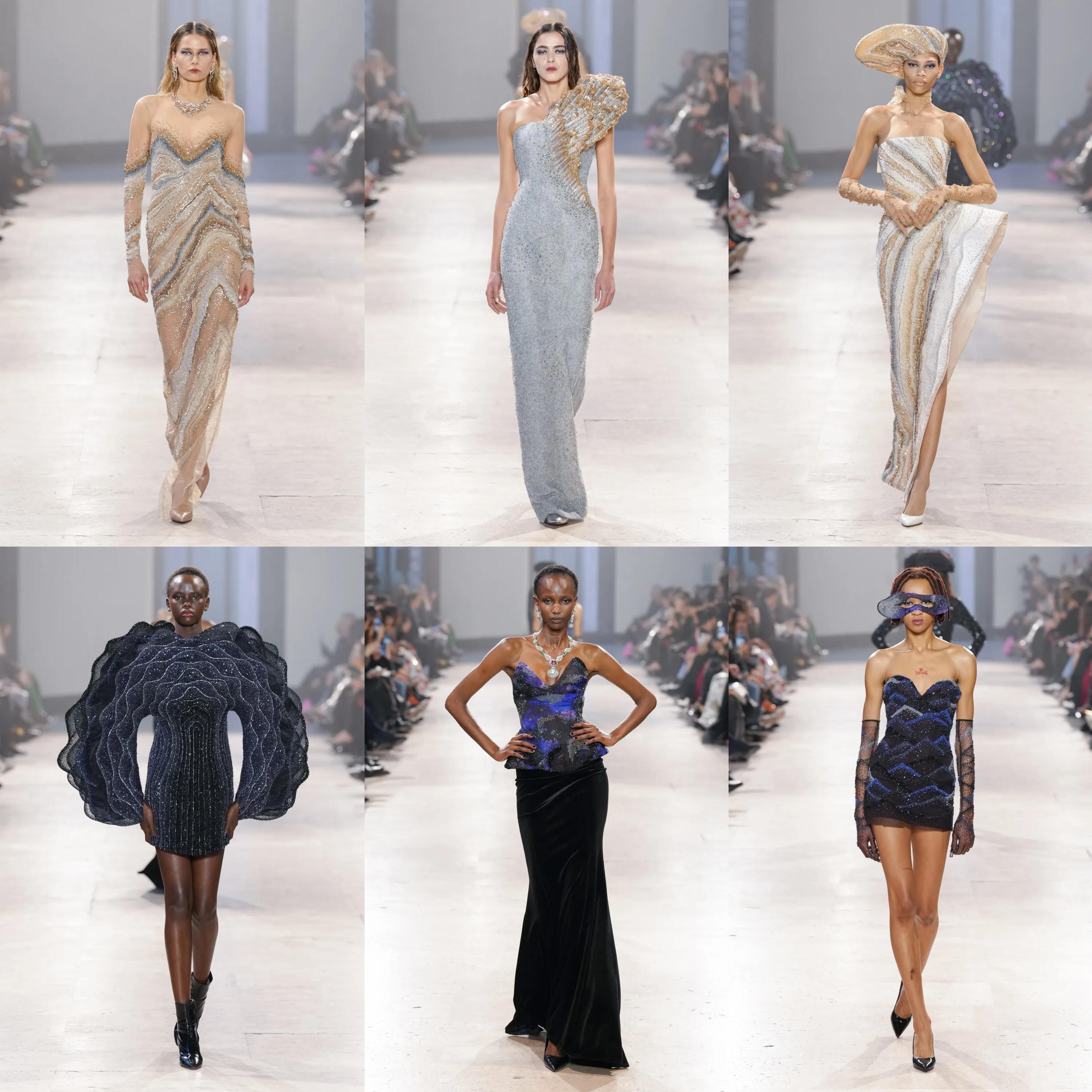 Rahul Mishra 2026 春夏高定系列本季高定秀Rahul Mishra 展示了52套高定Look,近两年品牌在内娱活动、盛典、杂志频繁曝光,成为内娱最追捧的高级定制品牌。该系列被命名为“Alchemy”,核心灵感是来自印度哲学五大元素(地、水、火、风、空)与服装结合在一起,利用立体刺绣表达“风”的流动感,面料肌理呈现“水”的波纹质感,将自然之力具像化。巴黎高定时装周大秀直击