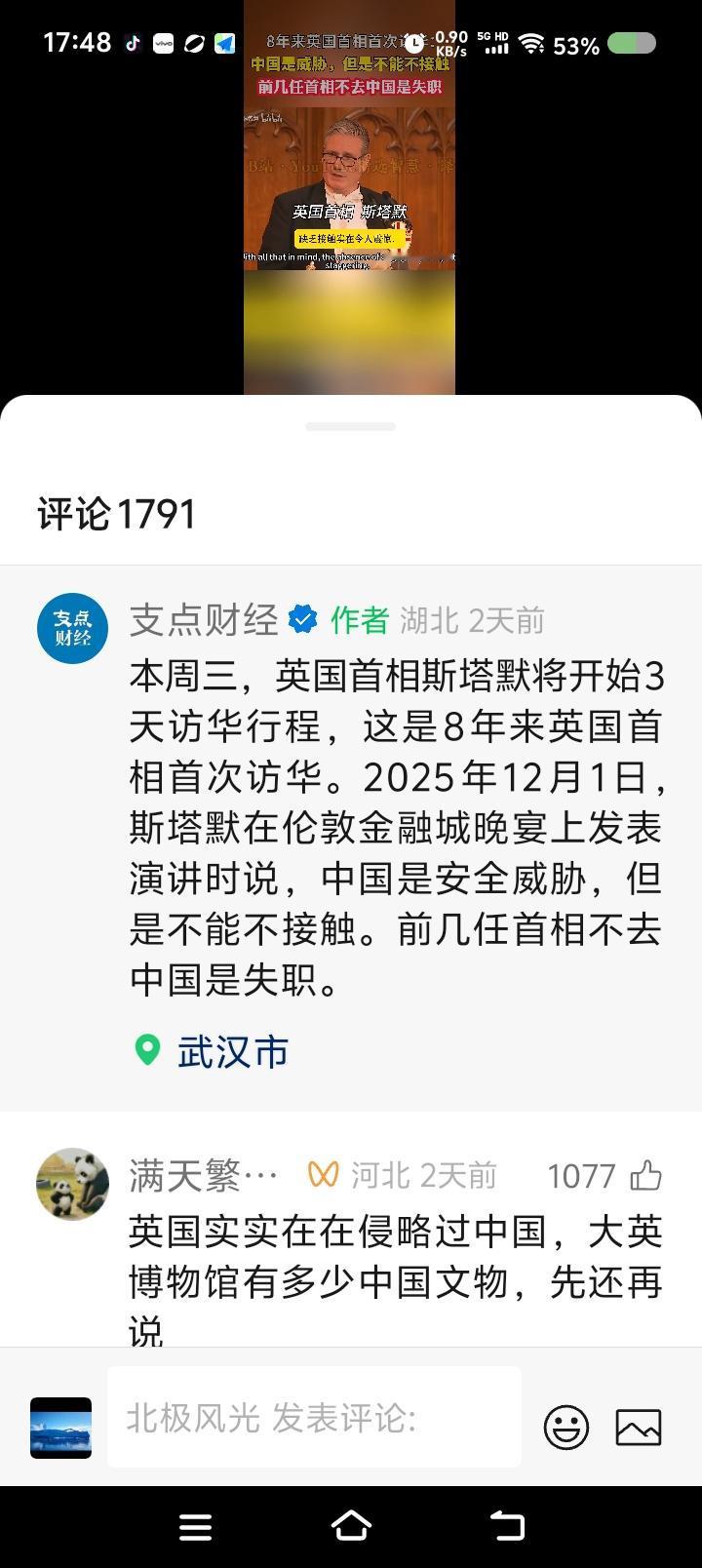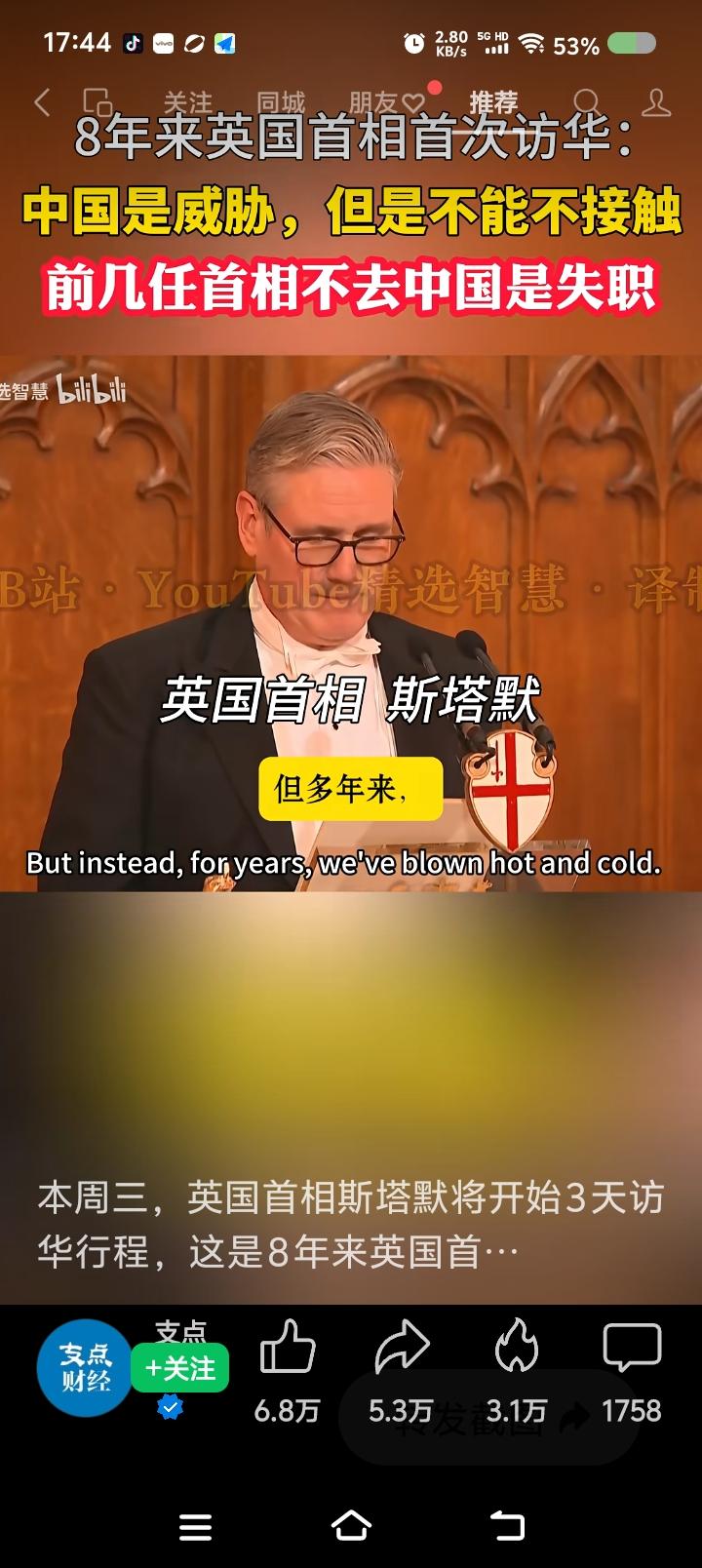 这是英国首相说的话?—— 据报道,去年12月1日,英国首相斯坦默在伦敦演讲:“中国是威胁,但不能不接触,英国需要一套正视现实的对华政策。” 点评: 帝国主义的冷战思维,赤裸裸地投机政客。 宇宙有多远,闪多远!