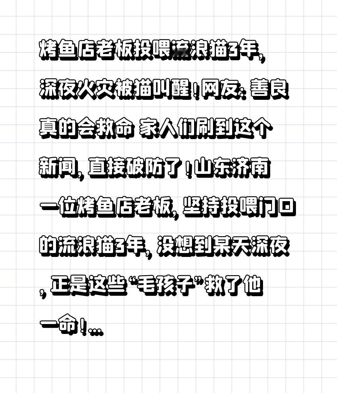 烤鱼店老板投喂流浪猫3年,深夜火灾被猫叫醒!网友:善良真的会救命 家人们刷到这个新闻,直接破防了!山东济南一位烤鱼店老板,坚持投喂门口的流浪猫3年,没想到某天深夜,正是这些“毛孩子”救了他一命!这场跨越物种的双向奔赴,看完心里暖烘烘的! 老板姓李,开烤鱼店已经8年了。3年前的冬天,门口来了3只瘦骨嶙峋的流浪猫,李老板看着心疼,每天收摊后都会把剩下的烤鱼边角料、米饭留出来喂它们。慢慢的,流浪猫从3只变成了5只,不管刮风下雨,每天都会准时在店门口等他,有时候还会跟着他进店转一圈,像“小保镖”一样。 谁也没想到,这无心的善举,竟在关键时刻救了他!1月25号凌晨2点多,李老板在店里二楼休息,突然被一阵急促的猫叫声吵醒。“平时猫晚上都很安静,那天叫得特别凶,还一个劲用爪子扒门”,李老板迷迷糊糊起身,刚打开房门就闻到一股刺鼻的焦糊味,楼下餐厅已经冒出了黑烟! 他赶紧拿起灭火器冲下去,发现是厨房的电路老化短路,引燃了旁边的纸箱,火势已经蔓延到了操作台。多亏被猫叫醒得及时,他只用了10多分钟就扑灭了火,没有造成更大的损失。消防人员赶来后说:“再晚10分钟,火势烧到燃气管道,后果不堪设想!” 更让人感动的是,灭火的时候,5只流浪猫没有跑远,就在店门口焦急地打转,时不时还冲他叫几声,像是在担心他的安全。李老板看着这些“救命恩人”,眼眶都红了:“平时就是随手喂点吃的,没想到它们居然这么通人性,关键时候还能提醒我!” 其实这已经不是第一次有流浪动物救人的新闻了:大连的流浪狗叼着主人的衣角,把她从即将坍塌的墙下拉开;杭州的流浪猫在煤气泄漏时,连续挠门30分钟叫醒住户。这些毛孩子或许不懂什么大道理,但它们用最纯粹的方式,回报着人类的善意。 有网友评论:“你对世界温柔以待,世界也会对你报以善意”,还有人说:“善良从来都不是单方面的付出,而是一场双向的救赎”。李老板的经历告诉我们,举手之劳的善意,可能在不经意间就会成为生命的铠甲。 现在李老板已经给流浪猫搭建了温暖的窝,还带它们去做了绝育和体检,店里的招牌也加了一句“流浪猫投喂点,爱心不分物种”。生活中,我们或许不需要做惊天动地的大事,但一个小小的善举,就能温暖彼此的世界。 评论区聊聊,你有没有喂过流浪动物?或者遇到过让你感动的双向奔赴瞬间?点赞转发,让这份善良传递下去,愿每个温柔以待世界的人,都能被世界温柔守护!