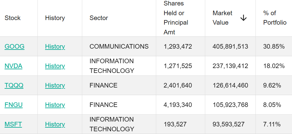 截至2025年底,东方港湾海外基金共持有10只标的,前五大重仓分别为:谷歌、英伟达、TQQQ(3倍做多纳斯达克100ETF)、FNGU、微软。