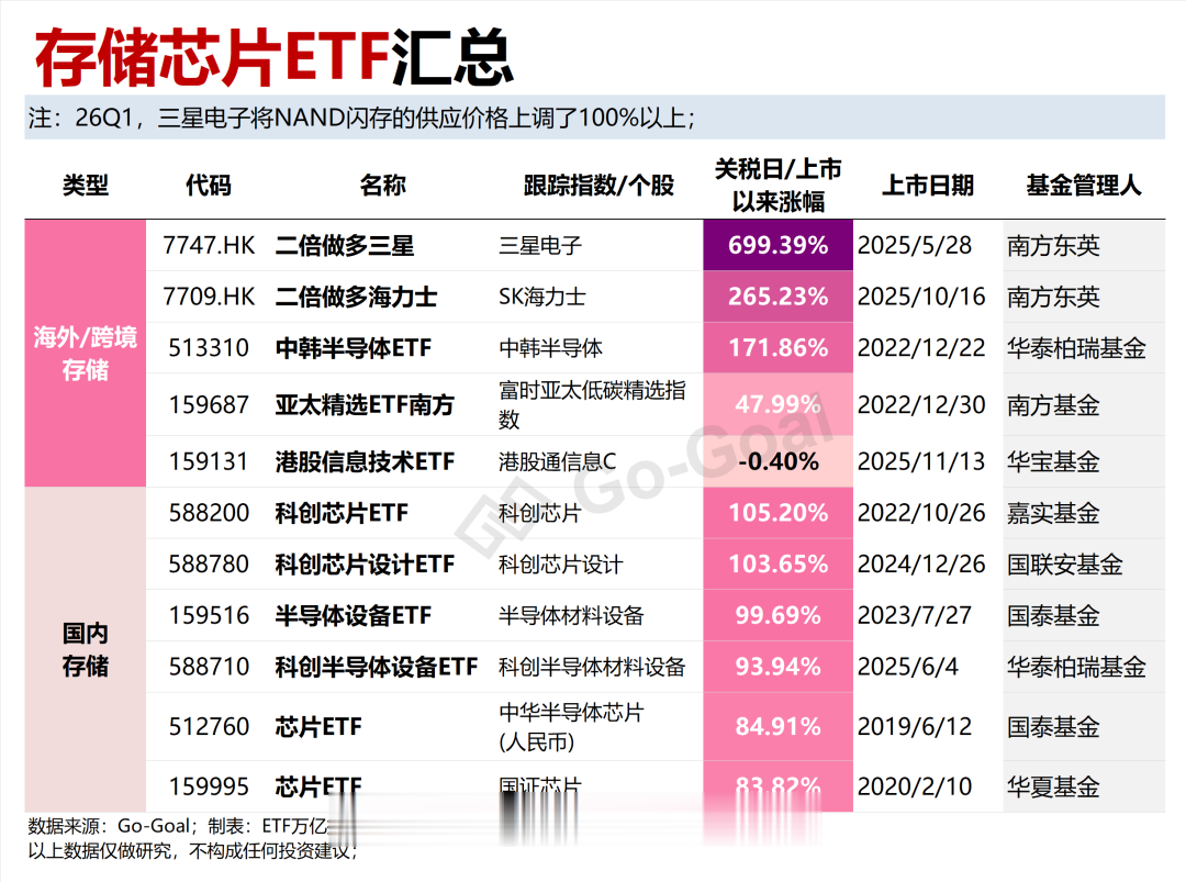 表格汇总了存储芯片相关的ETF,主要分为海外/跨境和国内两大类。核心信息是,受益于2026年第一季度三星电子将NAND闪存价格大幅上调超100%的行业利好,相关ETF普遍涨幅惊人。