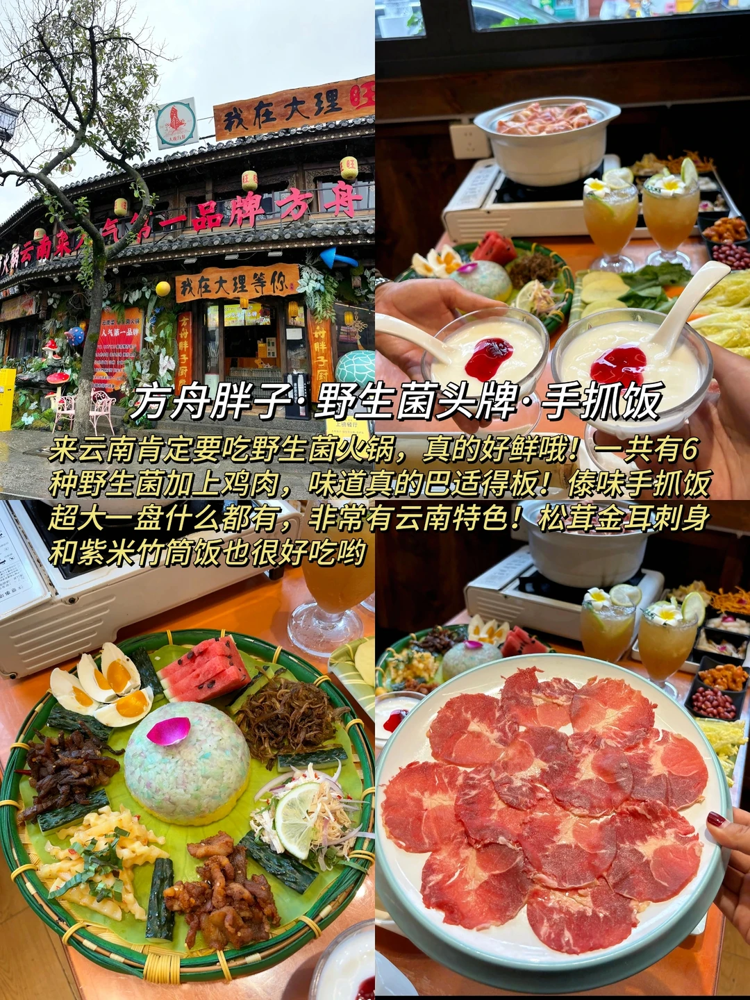 方舟胖子·野生菌头牌·手抓饭:云南大理野生菌火锅就来这家!汤底真的鲜得很,有十几种菌子,真的太香了!傣味手抓饭也很开胃,三宝鸡创新吃法~ 松茸金耳刺身也很好吃!