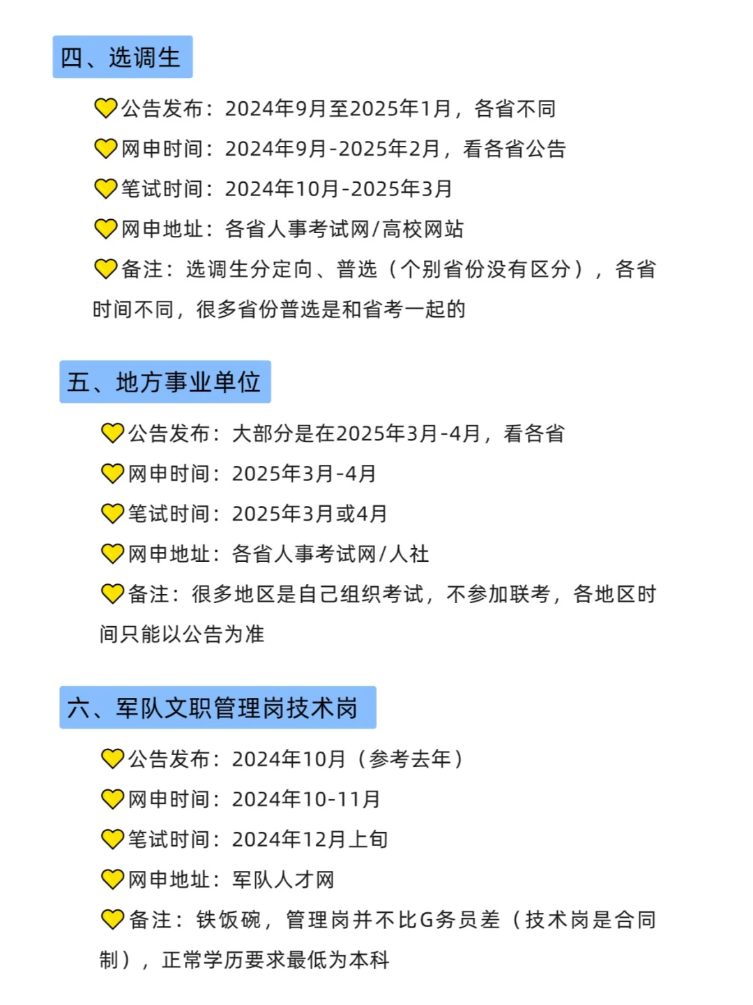 备注:选调生分定向、普选(个别省份没有区分),各省时间不同,很多省份普选是和省考一起的