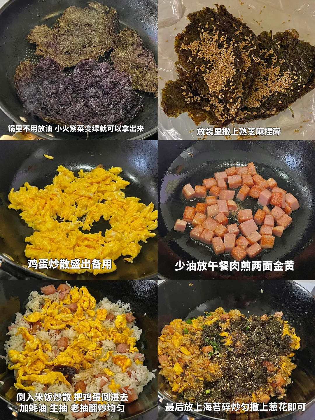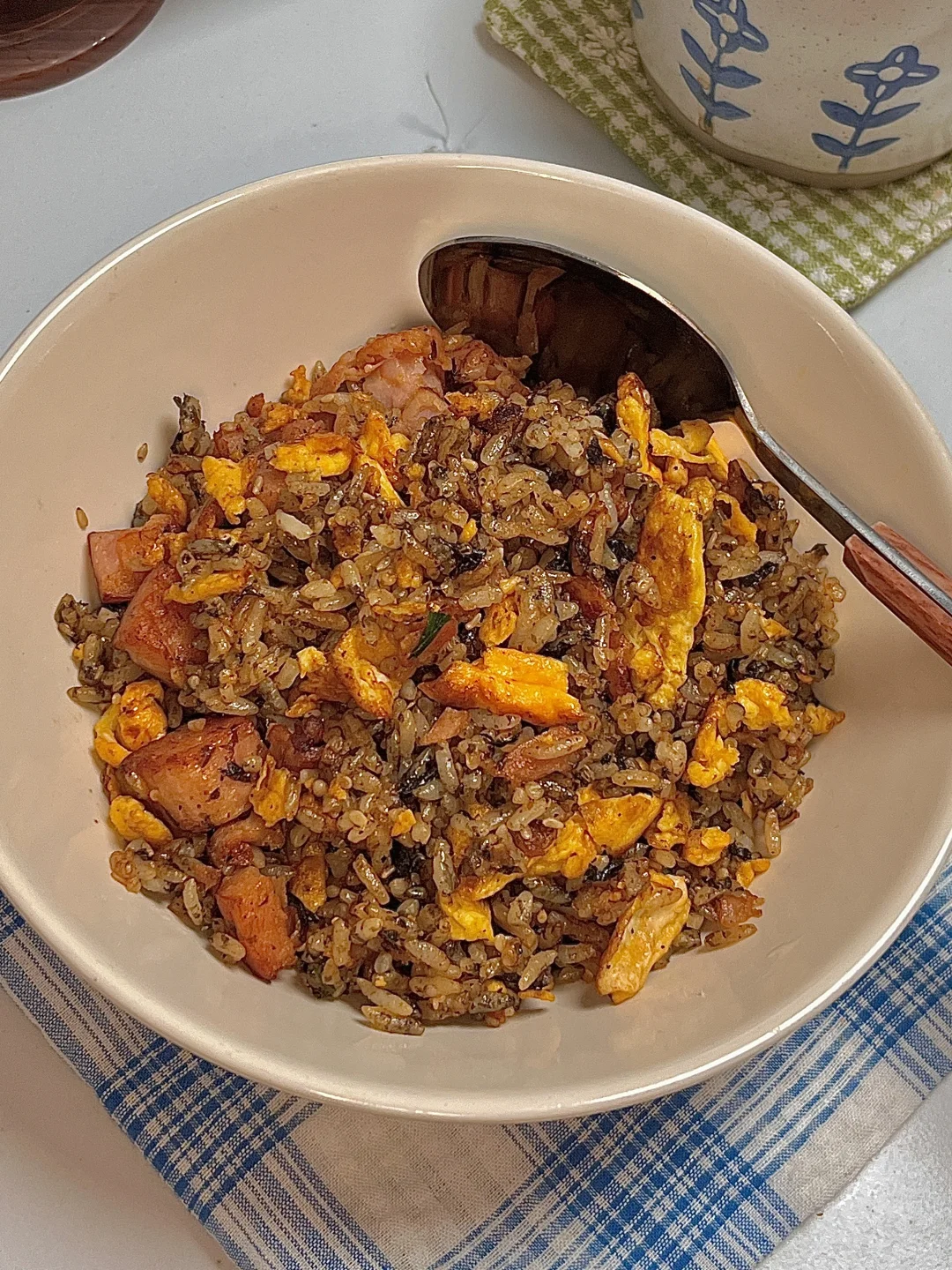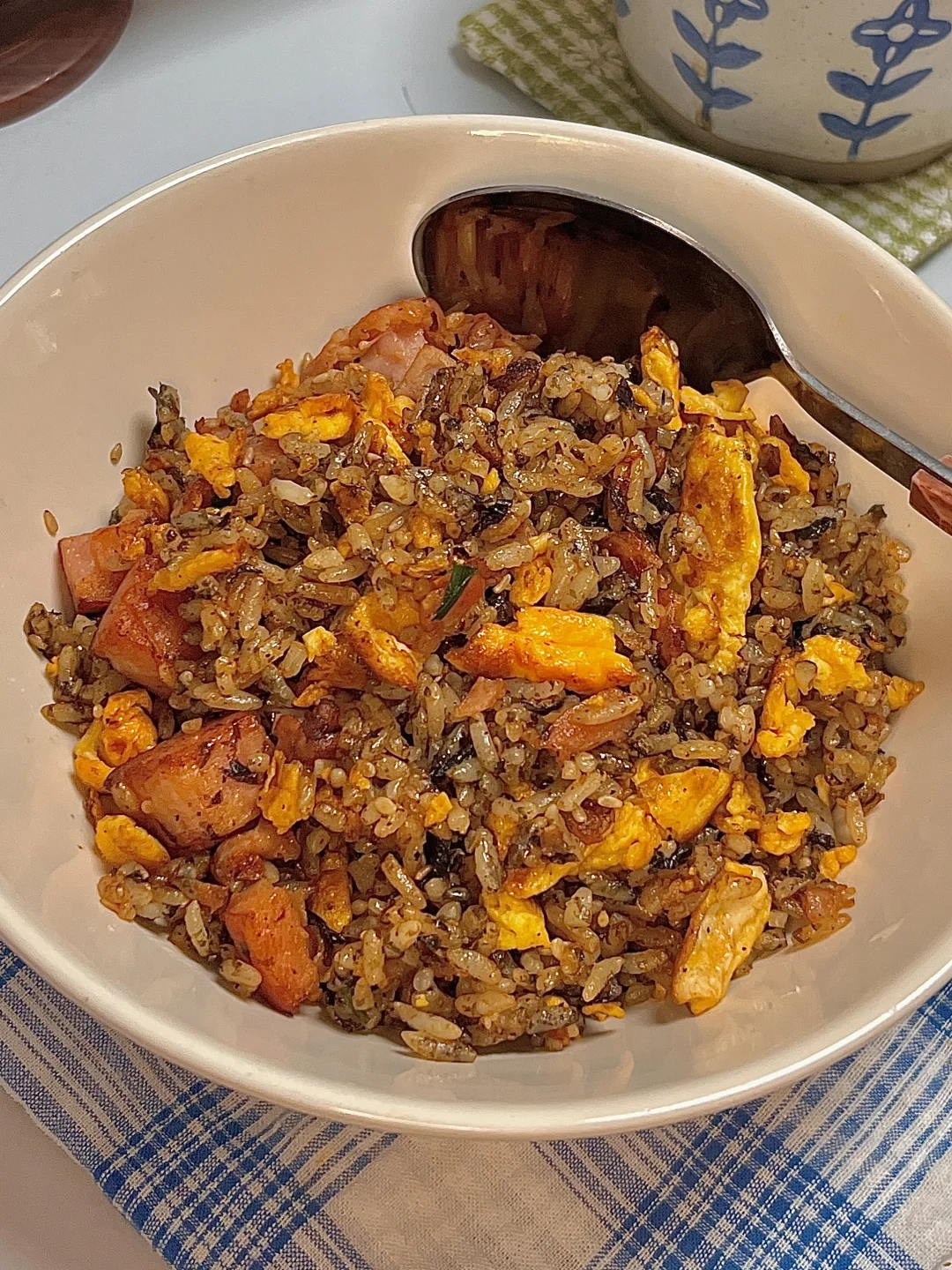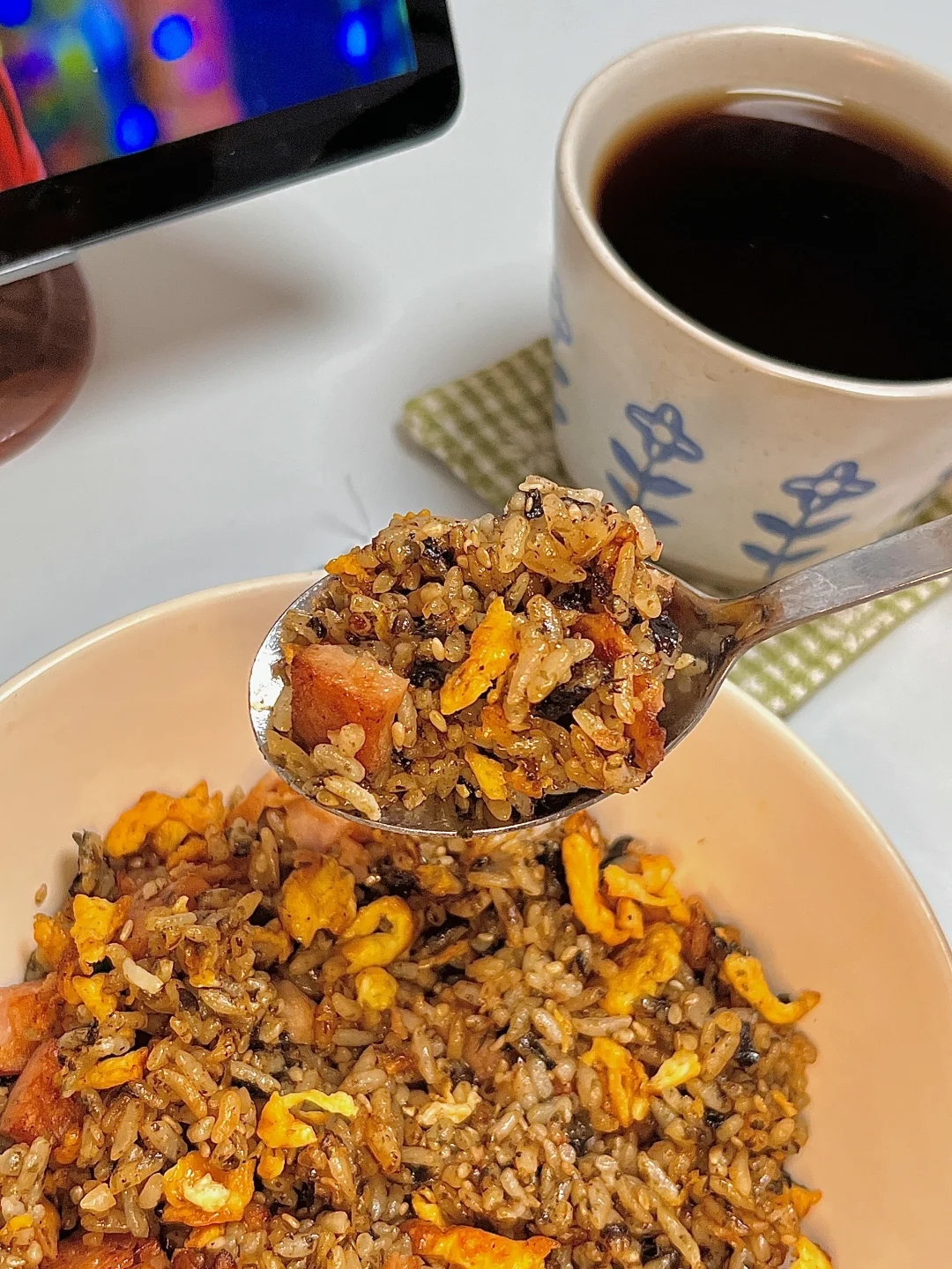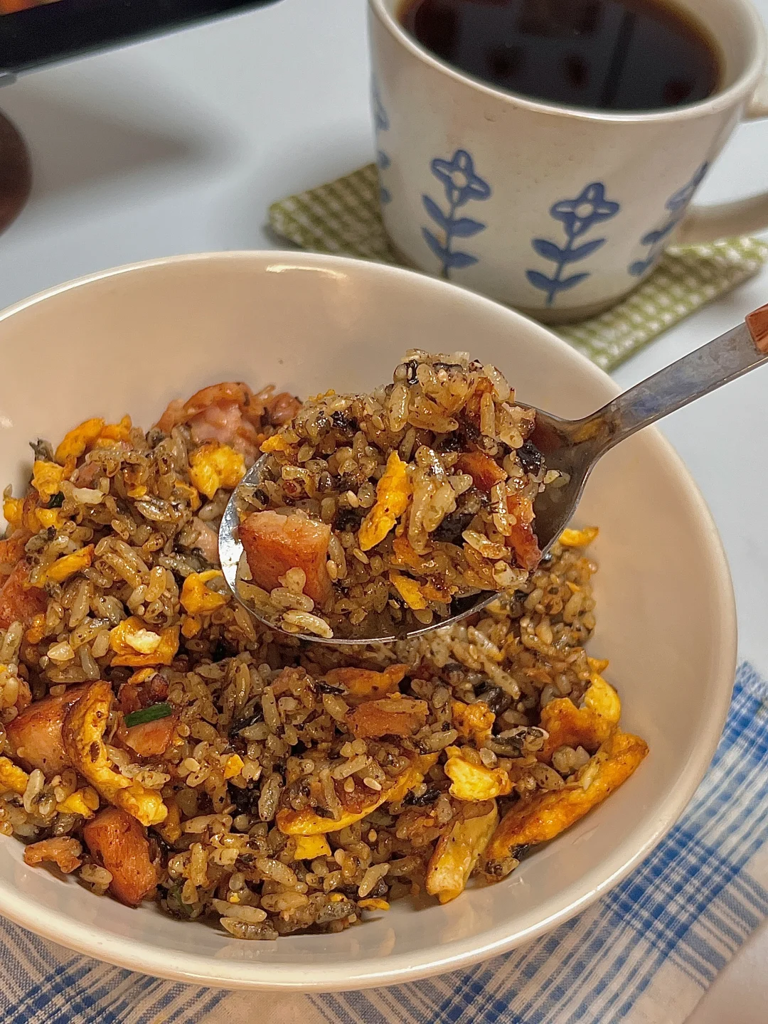 今日份一人食: 海苔炒饭 美式 . 这碗海苔炒饭一点也不输烤肉店的🍙 煎过的鸡蛋和午餐肉很香!米饭粒粒分明、咸香饱满,有肉有蛋还有海苔碎 越嚼越香 好吃到根本停不下来👍有剩米饭就这样做超好吃😋