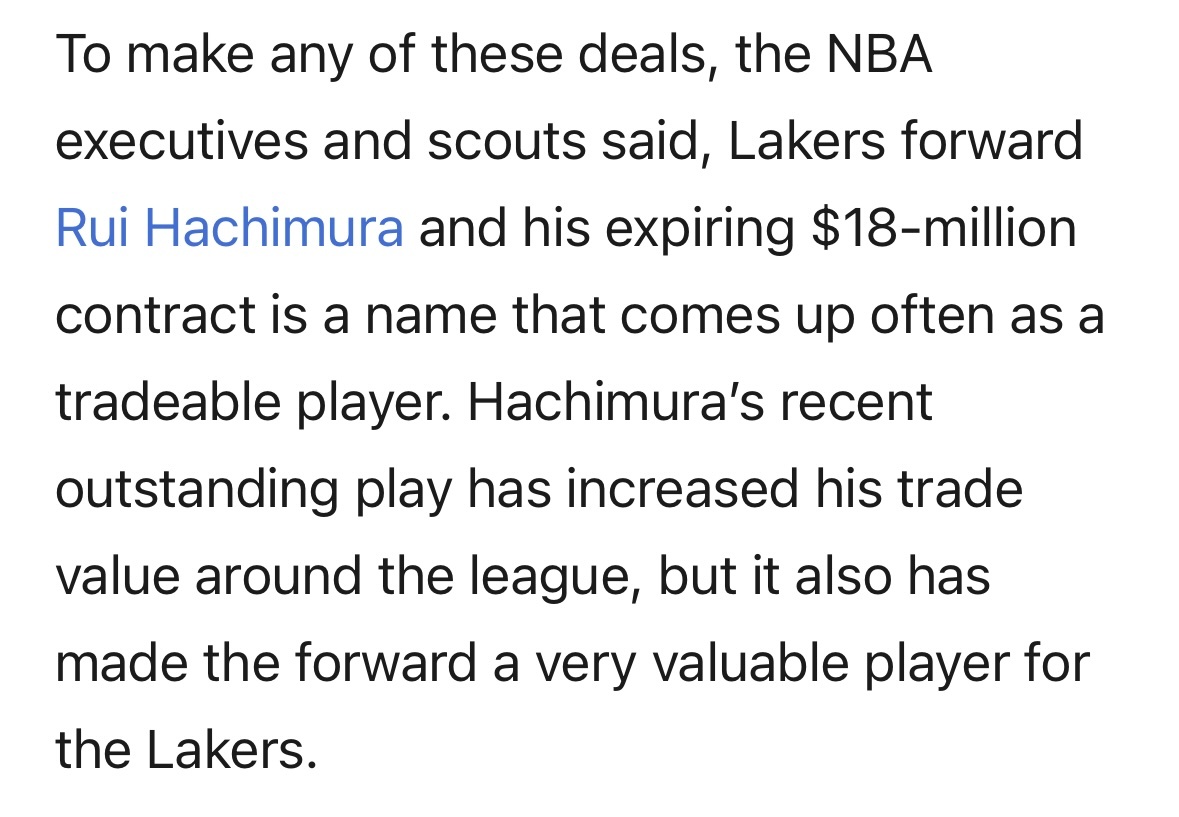 湖人记者Brad Turner:多位NBA高管与球探透露,若要完成上述任何一笔交易,湖人前锋八村塁都会是频繁被提及的可交易筹码。他价值1800万美元的合同即将到期,非常适合用作交易资产。八村塁近期状态出色,大幅提升了他在联盟的交易价值,但同时也让他成为湖人阵中不可或缺的重要球员。