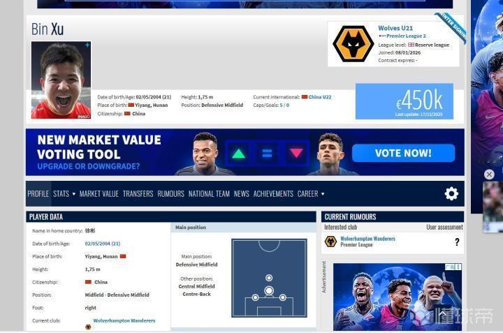 【德转显示徐彬正式加盟狼队U21梯队】当地时间1月28日,据德国转会市场的最新数据,中国U23国脚徐彬以自由转会的方式加盟了狼队U21。徐彬现年21岁,出生于2004年5月2日,出自恒大青训,现德转身价45万欧元。2025年,徐彬加盟青岛西海岸,代表球队各项赛事出战30场,贡献3次助攻。在刚刚结束的U23亚洲杯中,徐彬作为主力中场,跟随中国U23取得了亚军,创造了球队在U23亚洲杯上的历史最佳战绩。徐彬将加盟狼队U23国足徐彬