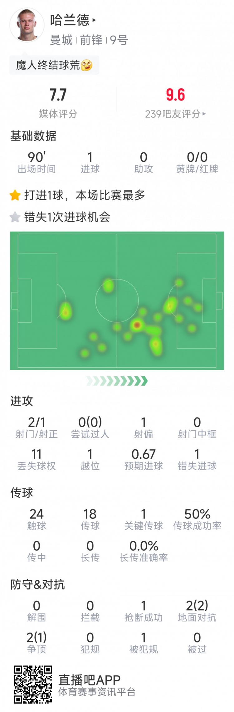 直播吧1月29日讯在本轮欧冠,曼城2-0击败加拉塔萨雷。以下为哈兰德本场数据: