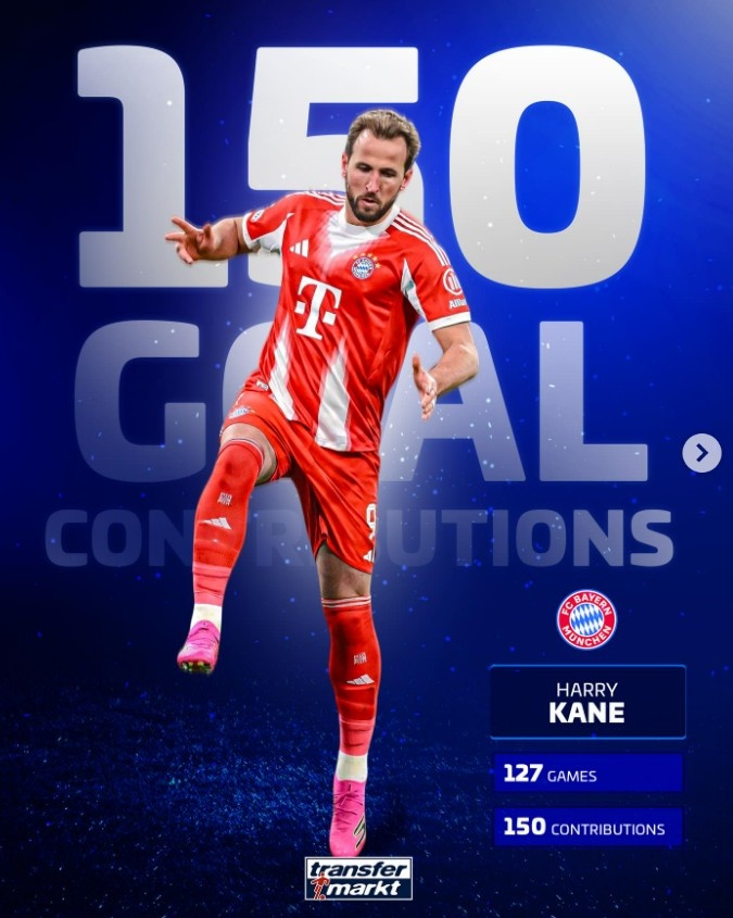 本场比赛凯恩破门,这也是他拜仁生涯各项赛事为球队直接参与的第150粒进球,用时127场比赛(120球30助)。