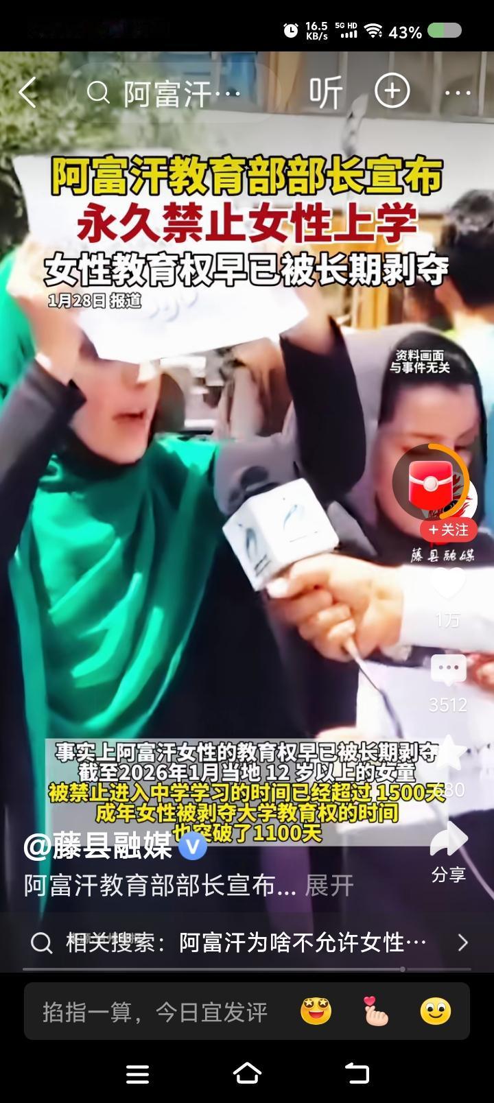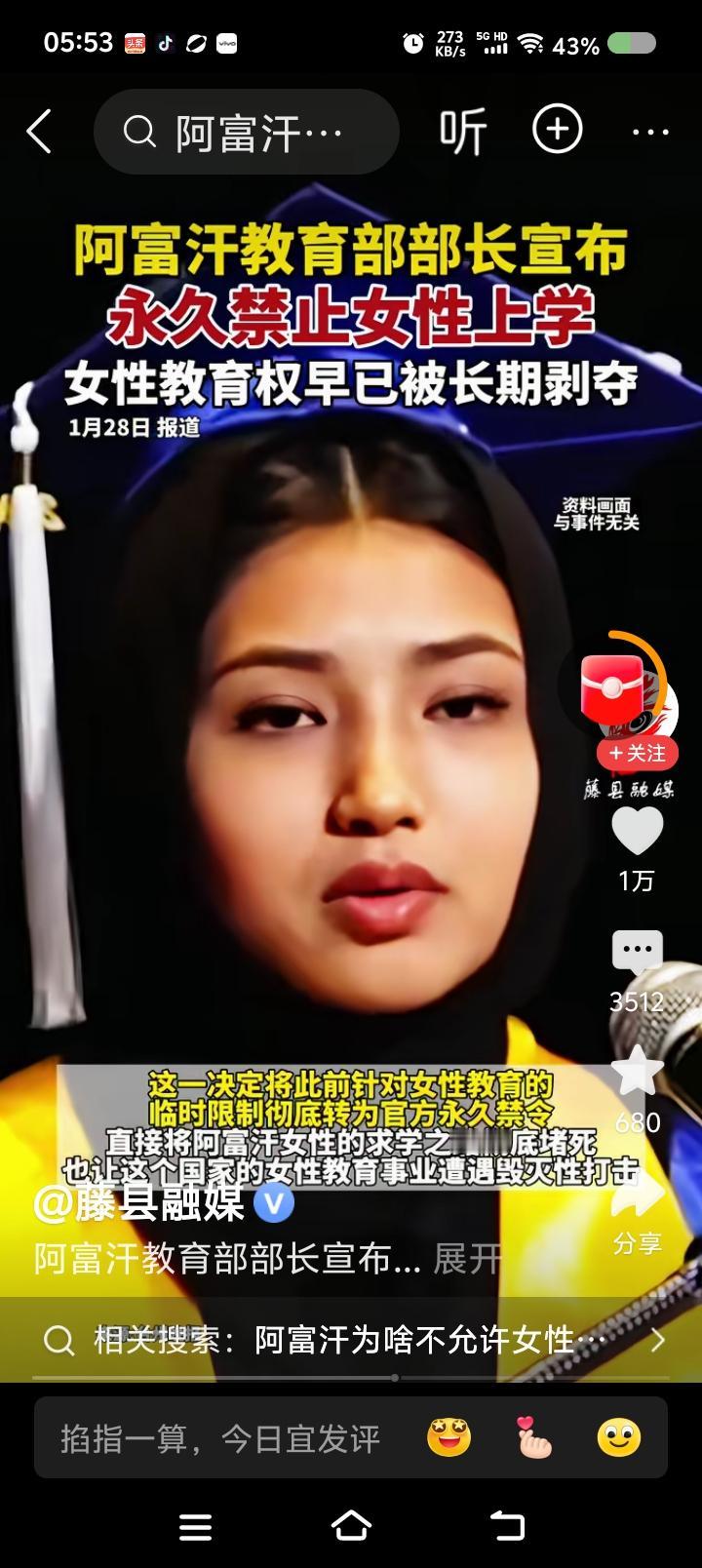 阿富汗怎么了?—— 据报道,阿富汗塔利班教育部长宣布,永久禁止女性接受教育。对女性受教育的限制令变为永久禁令。 点评: 在中国人的思维里,这做法不仅是落后、愚昧、反潮流了,简直是反人类罪。 有些人拿宗教说事,说按教义如何如何。一边去。几千年前的宗教创立者为今天背锅么?全世界信伊斯兰教的那么多,怎么你就特殊? 资料显示,塔利班属伊斯兰教逊尼派,信奉原教旨主义。原教旨主义在基督教中也存在,简单来说就是反世俗,主张“政教合一”、“社政合一”。 阿富汗培利班1994年成立,1996年建立临时政府,推行极端宗教统治,禁止电影电视,限制娱乐活动,男人必须蓄发,女性必须蒙面,不允许女性接受教育。 你听听,这和监狱有什么区别? 与其说这是宗教问题,不如说是政治问题。 令人深思的是,塔利班能得到不少人拥护!是不是越是混乱,人们越容易迷失,越渴望一个强权?如同今日美国,特朗普越胡作非为,越强势,一些人越支持、越兴奋,尤其是中下层那些迷途的羔羊?受虐基因这么强大?