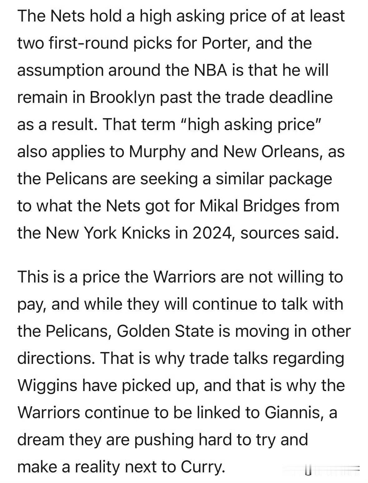 篮网不会降价,勇士转换新目标!!!勇士全力推动将字母哥交易! 根据记者Brett Siegel最新消息透露,本赛季小波特打出了不错的表现,篮网对他的交易持开放态度,不过要价不低,至少两个首轮签,这个要价可能会吓退很多球队,因此小波特本赛季预计不会离开篮网。 对小波特最感兴趣的无疑是勇士,面对篮网的疯狂要价,他们退而求其次去问价鹈鹕的墨菲,结果更是让人大跌眼镜,鹈鹕比篮网还狠,他们希望得到“贝恩”式的打劫报价,五个首轮直接劝退勇士。 勇士不想当冤大头,他们不得不转换目标,他们和热火沟通嘴哥威金斯的交易方案,已经有所进展,但是热火也要价一个首轮,这个价格倒是也可以接受,但是面对字母哥进入交易市场他们也心动了,他们渴望打造字母哥&库里的组合,如果真的可以实现,勇士冲击冠军的目标将会大大提升了。金州勇士 勇士队 字母哥 雄鹿队 NBA交易篮网 篮网波特 库里