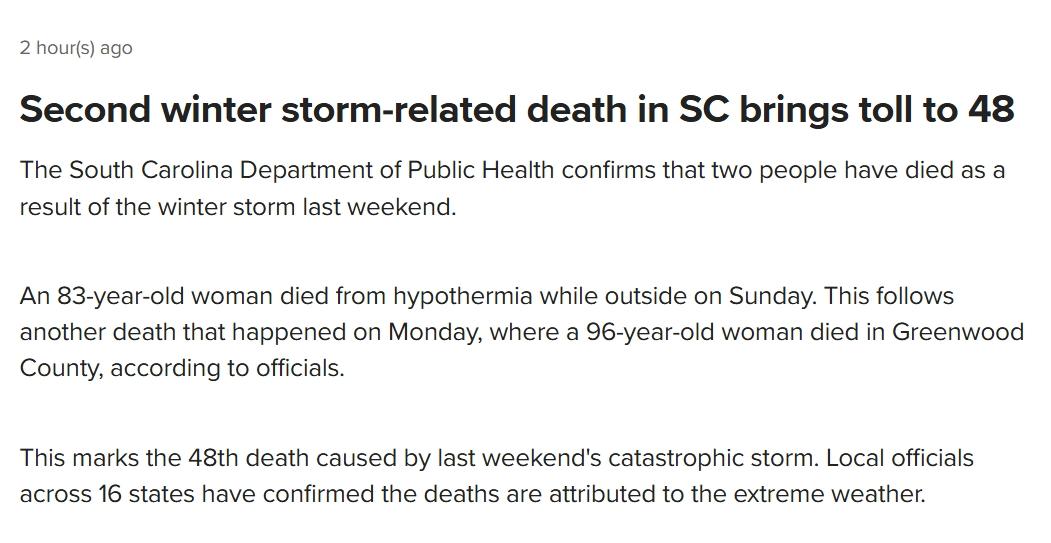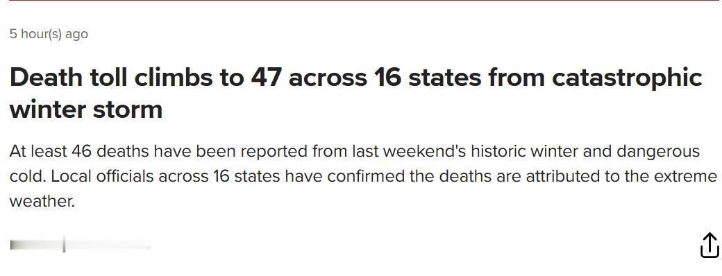 美国冬季风暴已造成超过上百人死亡 截止当地时间周三,肯塔基州报告新增8人死亡。 肯塔基州州长安迪·贝希尔宣布,上周末的冬季风暴又造成8人死亡,使总死亡人数达到56人。 南卡罗来纳州公共卫生部确认,上周末冬季风暴造成两人死亡。 一名83岁的妇女周日在户外因体温过低去世。,格林伍德县一名96岁女性死亡。这是上周末灾难性风暴造成的第48起死亡事故。 已有16个州的地方官员已确认有人死亡,死亡归因于极端天气。