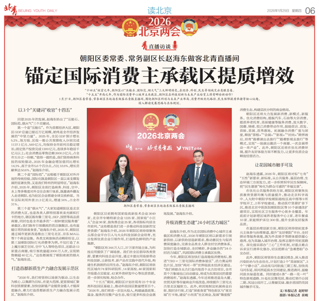 1月27日,朝阳区委常委、常务副区长赵海东做客北青报直播间,围绕朝阳区科创与未来产业布局、消费升级优化路径、民生保障提质举措等核心议题,深入解读发展思路与具体规划。