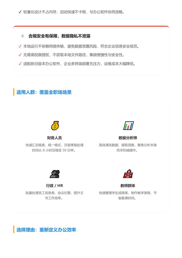 写在自己做表格插件之后 自从自己动手开发表格插件,我才算真正读懂了办公人对着 Excel/WPS 叹气的心情。 最开始只是想解决自己日常工作里的痛点:每月要花大半天清理重复数据、统一格式,还要在不同表格间来回复制粘贴。这些重复操作既耗时间又容易出错。抱着“自己动手,丰衣足食”的想法,我开始了这个插件的开发。 开发过程里,最大的挑战不是技术,而是真正把“用户视角”刻进功能里。比如批量处理功能,最初只是做了基础的删空行,后来发现同事们还需要合并多表、生成带跳转的目录页,我就一点点迭代优化。当看到测试用户反馈“以前要8小时的报表,现在50分钟就搞定了”,那种满足感比单纯实现技术功能强太多了。 做数据清洗模块时,我特意避开了复杂公式。我希望哪怕是非专业的行政或老师,也能轻松上手。我花了很多时间打磨界面,把高频功能放在最显眼的地方,比如“一键删空行”“身份证信息提取”。当看到用户不用再查教程,点一下按钮就能完成工作时,我知道这才是工具的意义——让技术服务于人,而不是让人适应技术。 本地运行这个设计,是我坚持的底线。我深知办公数据的敏感性,所以插件全程不联网、不获取文件路径。当企业用户说“终于不用担心里面的员工信息泄露了”,我明白这份信任,比任何功能都重要。 看着现在的插件界面,从最初的几个按钮,到现在“快捷工具”“高级数据处理”“一户一表”等完整模块,我感触最深的是:好的办公工具,从来不是炫技,而是把复杂留给开发者,把简单留给使用者。每一次功能迭代,都是一次对“效率”的重新理解——它不是快几秒,而是让用户能从机械重复里解放出来,去做更有价值的事情。 最后,在这里也特别感谢朋友们给我提供的宝贵建议,让插件功能更加完善。