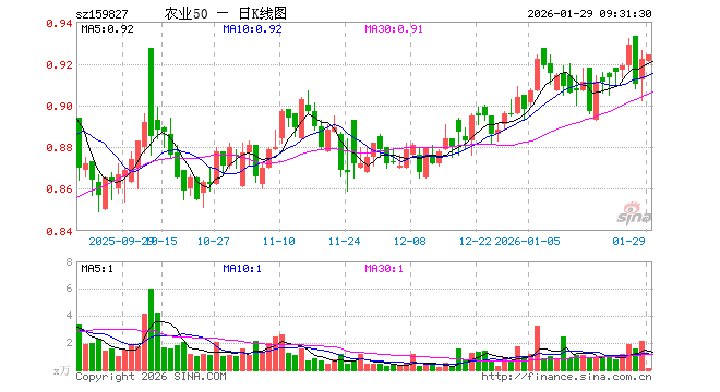 1月29日,农业50ETF(159827)开盘跌0.11%,报0.921元。农业50ETF(159827)重仓股方面,牧原股份开盘跌0.64%,温氏股份涨0.39%,海大集团涨0.00%,藏格矿业涨0.00%,盐湖股份跌1.08%,亚钾国际跌0.59%,正邦科技跌0.60%,新希望涨0.11%,梅花生物涨0.18%,扬农化工涨0.01%。