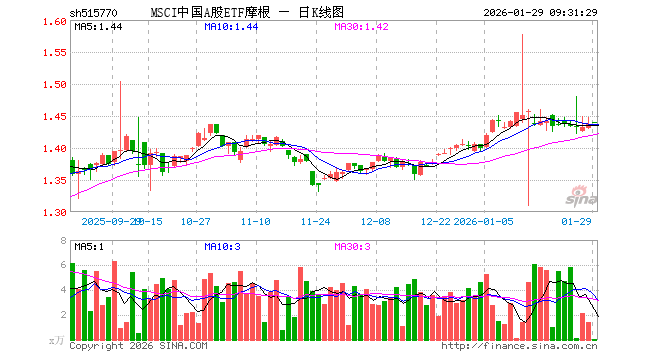 1月29日,MSCI中国A股ETF摩根(515770)开盘涨0.28%,报1.440元。MSCI中国A股ETF摩根(515770)重仓股方面,贵州茅台开盘涨0.85%,宁德时代涨0.15%,招商银行涨0.21%,工业富联跌0.02%,中国平安涨0.43%,紫金矿业涨3.52%,中际旭创涨1.43%,长江电力涨0.00%,农业银行跌0.59%,寒武纪跌0.05%。
