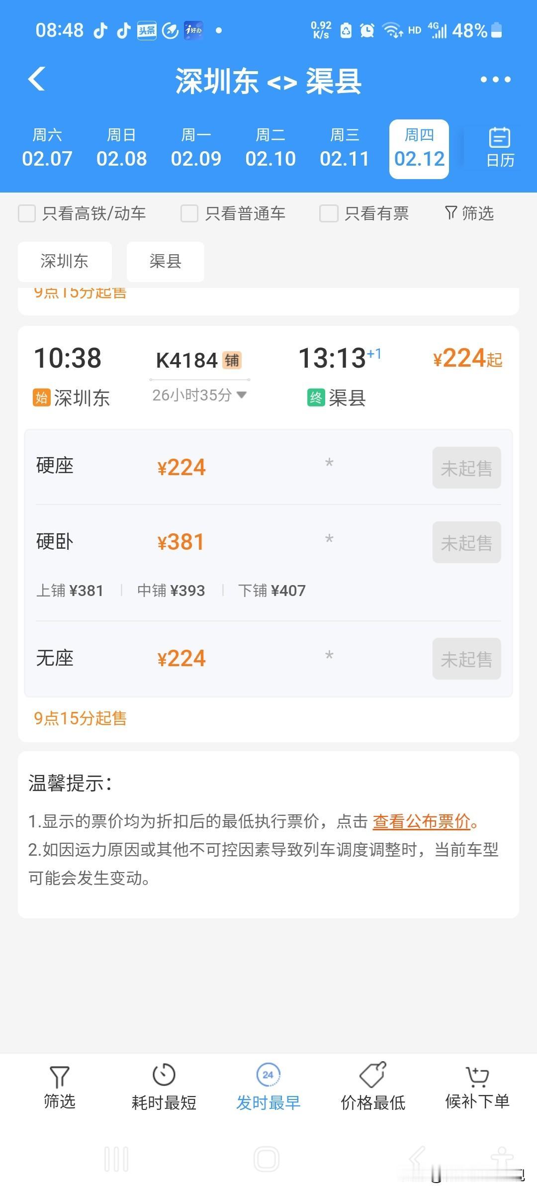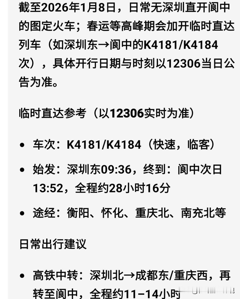 团体票订购深圳东到阆中的旅客不要等了 经过多方信息和12306官方窗口求证:往期春运加开的K4181/K4184次列车终到站由阆中改为渠县了,深圳到阆中春运期间无直达车了。 原本在富士康集团通过手工填写的深圳东至阆中车票无望了,希望订购此车次的同仁重新在12306官方下单。 看来阆中在深圳的打工人少了,国家为了让大家方便快捷的乘坐高铁,把绿皮车向人囗众多的广安和渠县进行了转移。 阆中作为春节发源地、中国四大古城之一,更是在上年度在联合国夺得世界古城文化遗产名录榜!此次车次的变化调整,不仅体现了国家发展阆中高铁的愿望,更体現了国家想要把阆中建设成为世界旅游目的地的决心。 阆中作为西南地区的一座县城,目前有飞机场一座,火车站拥有5个站台,更有5座跨江大桥和两条高速公路经过。 作为一名在深的阆中游子,虽然对没有订到直达车感到遗憾,但对于国家提档升级的决心还是比较赞同!