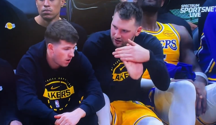 美媒PurpGolded晒出照片:“东契奇在替补席向里夫斯解释自己的伤情。”