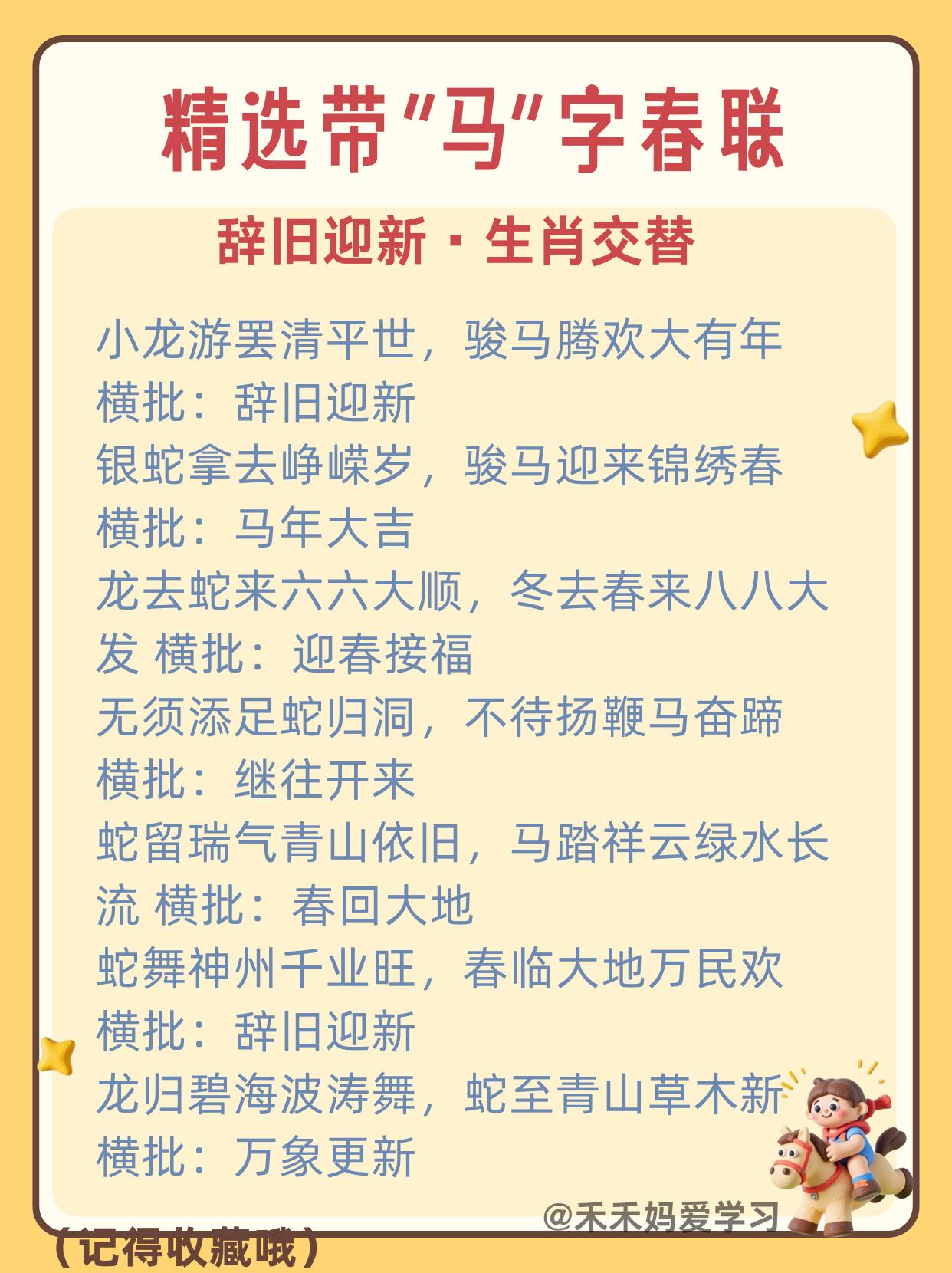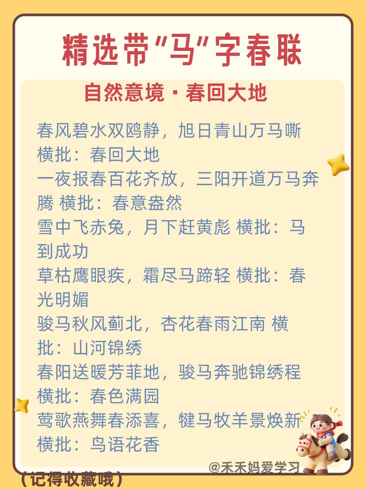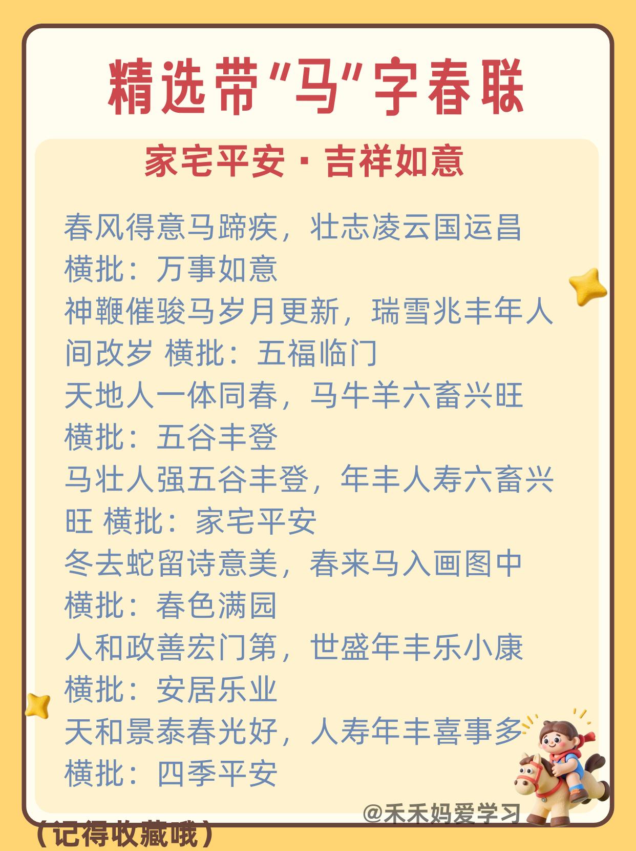 春节贴春联的习俗,在我国已传承了数千年,《山海经》记载:东海度朔山有大桃树,其下有神荼、郁垒二神,执鬼饲虎。 意思是东海度朔山下有个大桃树,桃树下有两位名叫神荼和郁垒的神仙,专门监管鬼门,维护阴阳秩序。 因此桃木被古人认为是五木之精,能够压制邪气,自周代起,老百姓便在桃木板上画神荼和郁垒的肖像,悬挂于门旁,称为“桃符”。 千门万户曈曈日,只把新符换旧符,这里的“符”便是指的“桃符”,用以驱鬼压制邪魅。 历经数千年的历史演变,尤其是到了造纸术普及的宋朝,桃木被纸张代替;明朝初期,开国皇帝朱元璋大力推广贴春联,一次他微服私访,见到一家人没有贴春联,便去询问缘由,结果得知该户是“阉猪人”,于是便亲笔写下:双手劈开生死路,一刀割断是非根,命人贴上,自此春节必须贴春联的习俗正式确立并延续至今。 经过数千年的传承,春节贴春联的意义早就超越了原始的驱鬼压邪的功能,承载了多重文化意义,一副好的春联不仅要对仗工整、平仄相协,符合楹联的格律要求,而且要寓意吉祥、雅俗共赏,承载书写者的美好愿景与时代精神。 给大家分享一些含马字的好春联,涵盖事业腾飞、家宅平安、福寿安康、国泰民安等多重寓意,愿诸君按需择取,贴出新春气象。