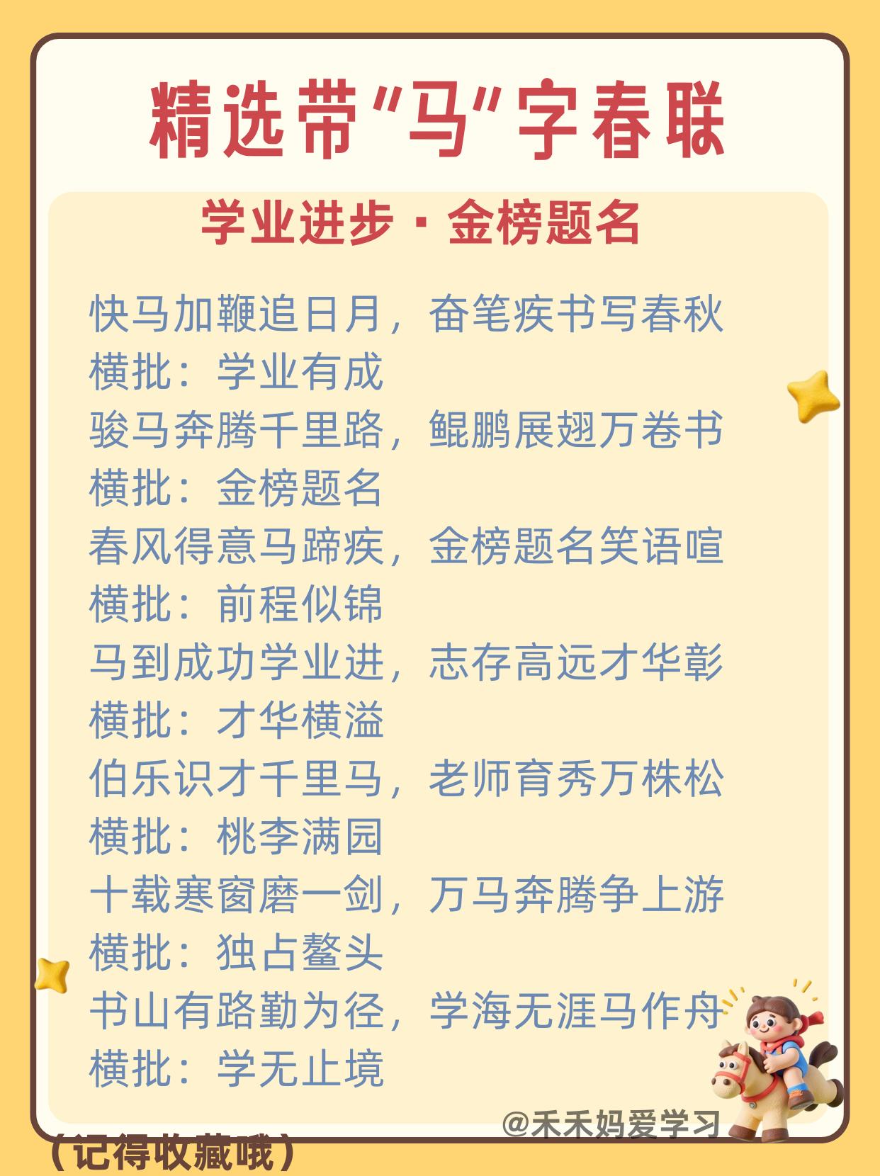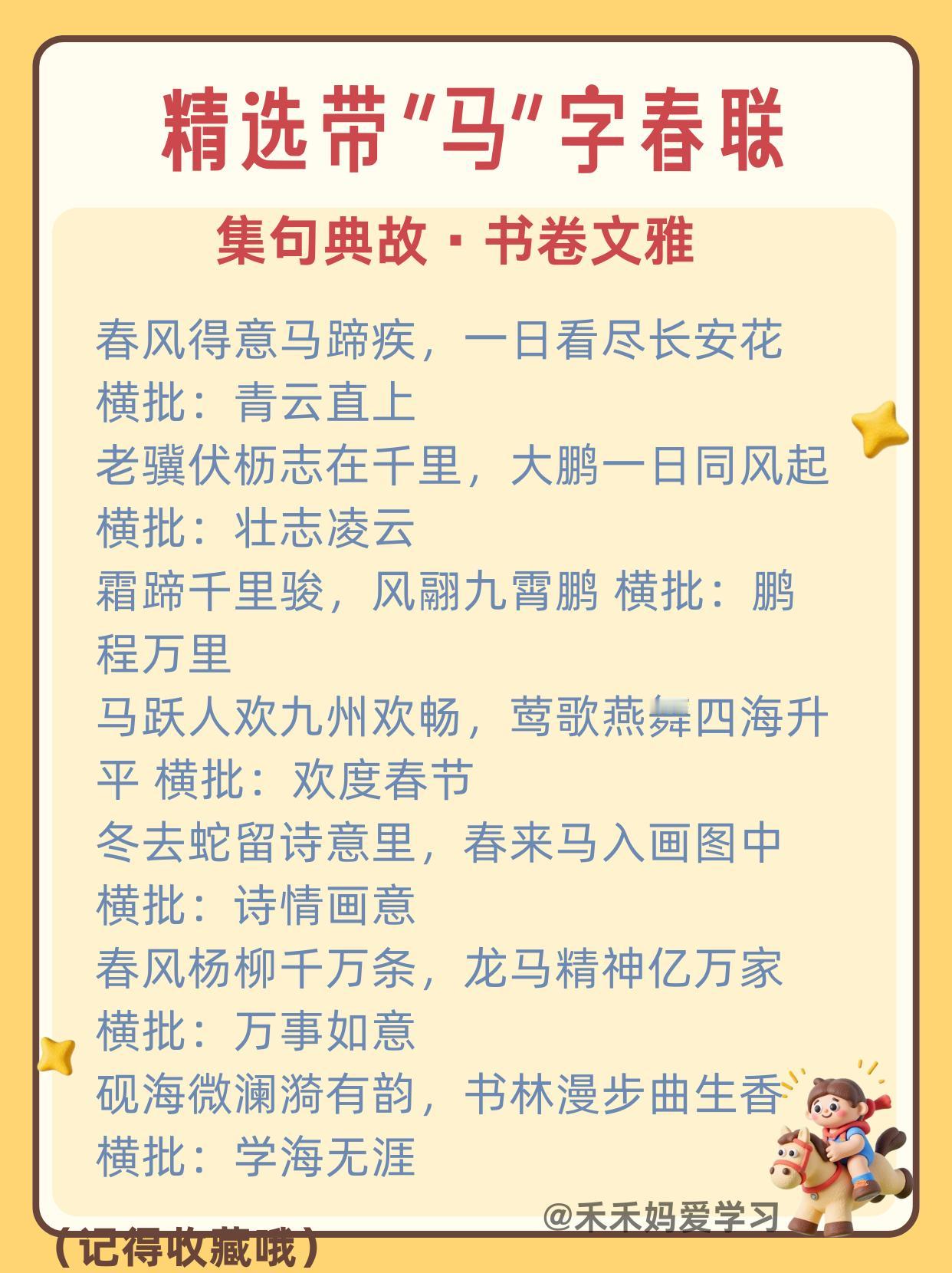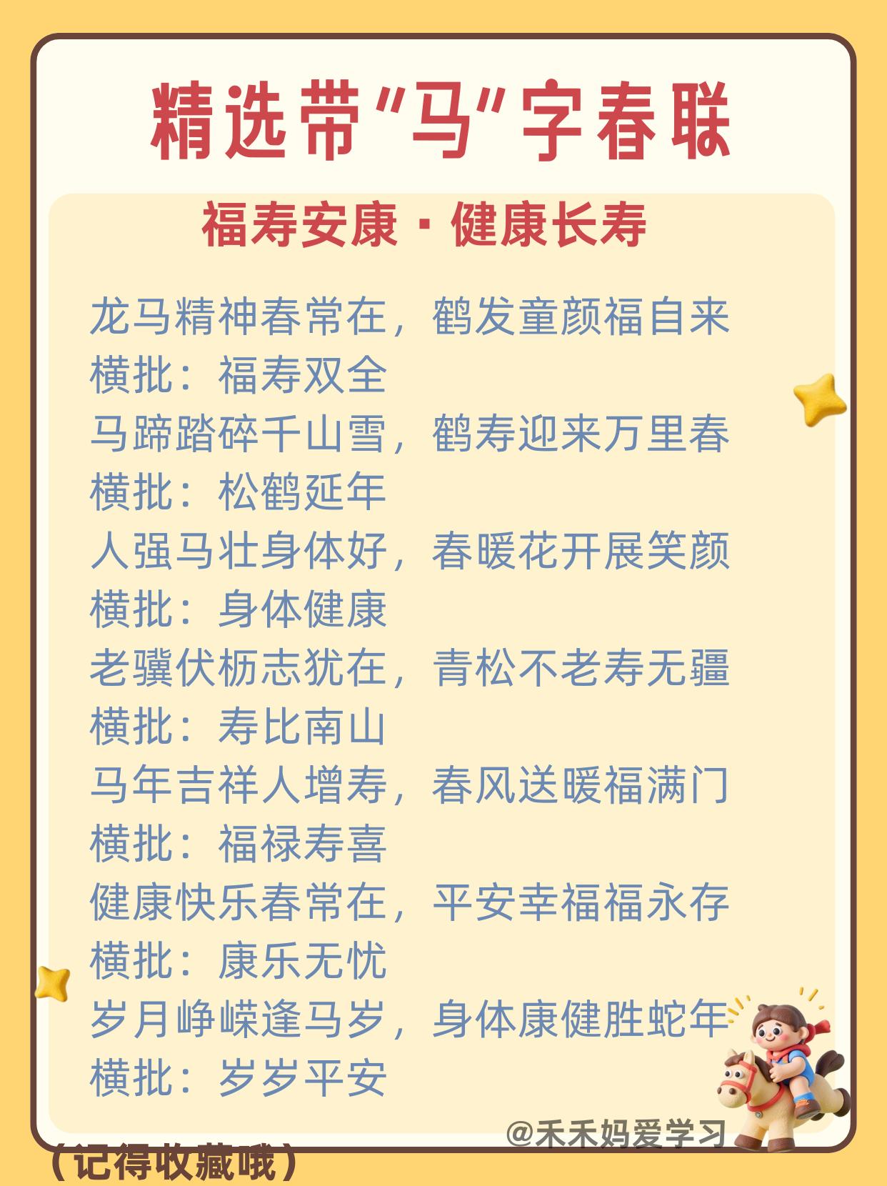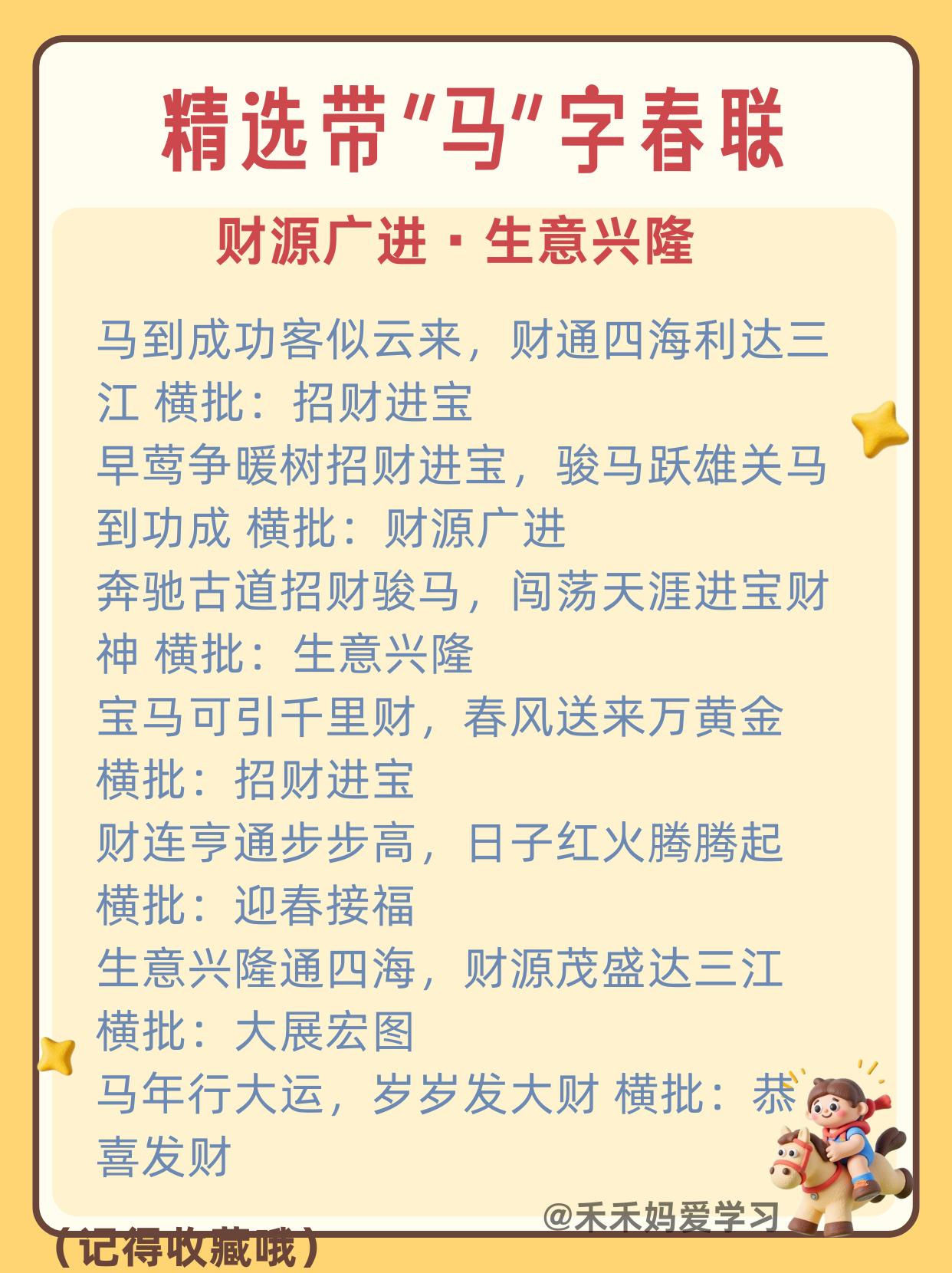 春节贴春联的习俗,在我国已传承了数千年,《山海经》记载:东海度朔山有大桃树,其下有神荼、郁垒二神,执鬼饲虎。 意思是东海度朔山下有个大桃树,桃树下有两位名叫神荼和郁垒的神仙,专门监管鬼门,维护阴阳秩序。 因此桃木被古人认为是五木之精,能够压制邪气,自周代起,老百姓便在桃木板上画神荼和郁垒的肖像,悬挂于门旁,称为“桃符”。 千门万户曈曈日,只把新符换旧符,这里的“符”便是指的“桃符”,用以驱鬼压制邪魅。 历经数千年的历史演变,尤其是到了造纸术普及的宋朝,桃木被纸张代替;明朝初期,开国皇帝朱元璋大力推广贴春联,一次他微服私访,见到一家人没有贴春联,便去询问缘由,结果得知该户是“阉猪人”,于是便亲笔写下:双手劈开生死路,一刀割断是非根,命人贴上,自此春节必须贴春联的习俗正式确立并延续至今。 经过数千年的传承,春节贴春联的意义早就超越了原始的驱鬼压邪的功能,承载了多重文化意义,一副好的春联不仅要对仗工整、平仄相协,符合楹联的格律要求,而且要寓意吉祥、雅俗共赏,承载书写者的美好愿景与时代精神。 给大家分享一些含马字的好春联,涵盖事业腾飞、家宅平安、福寿安康、国泰民安等多重寓意,愿诸君按需择取,贴出新春气象。