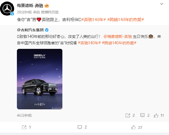 值得注意的是,小米汽车、理想汽车、蔚来汽车、吉利汽车、凯迪拉客等汽车企业纷纷送上祝福。雷军也发文表示,致敬行业先进者,祝奔驰140岁生日快乐。