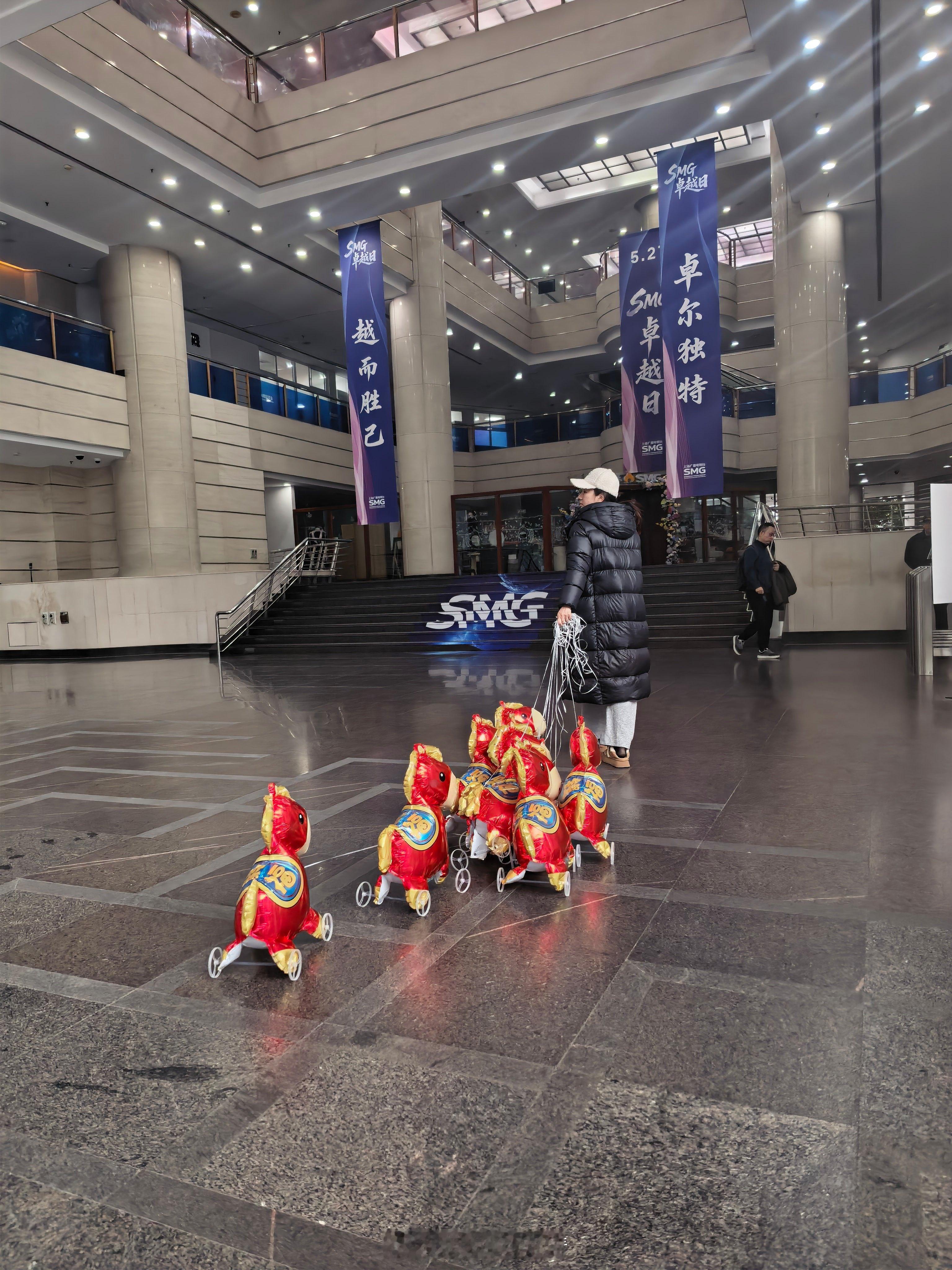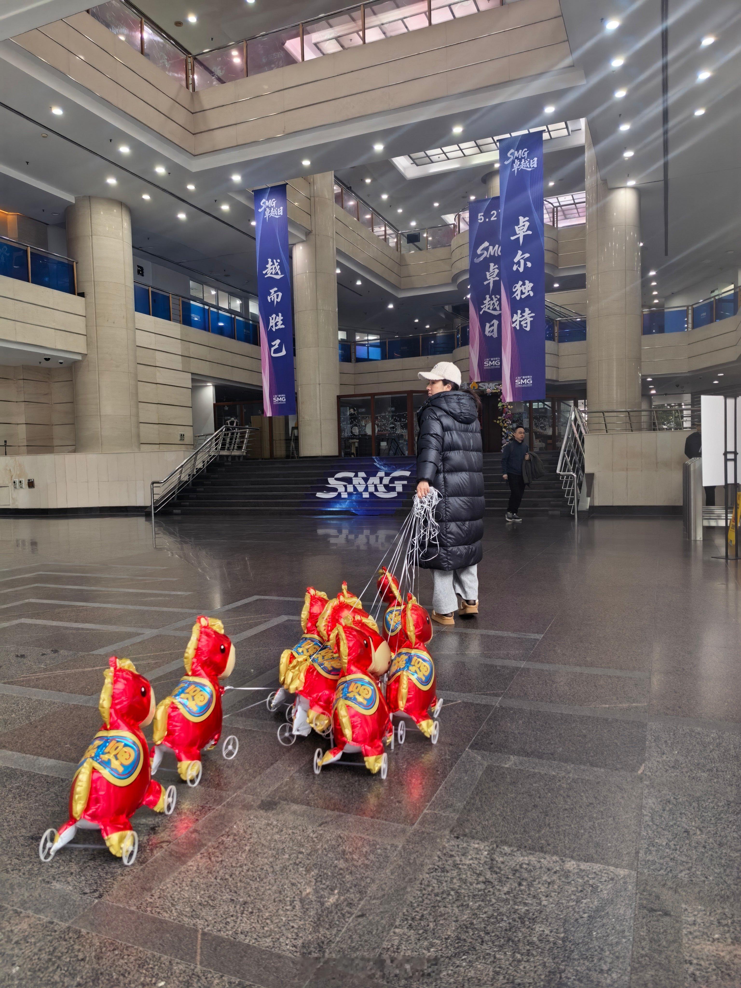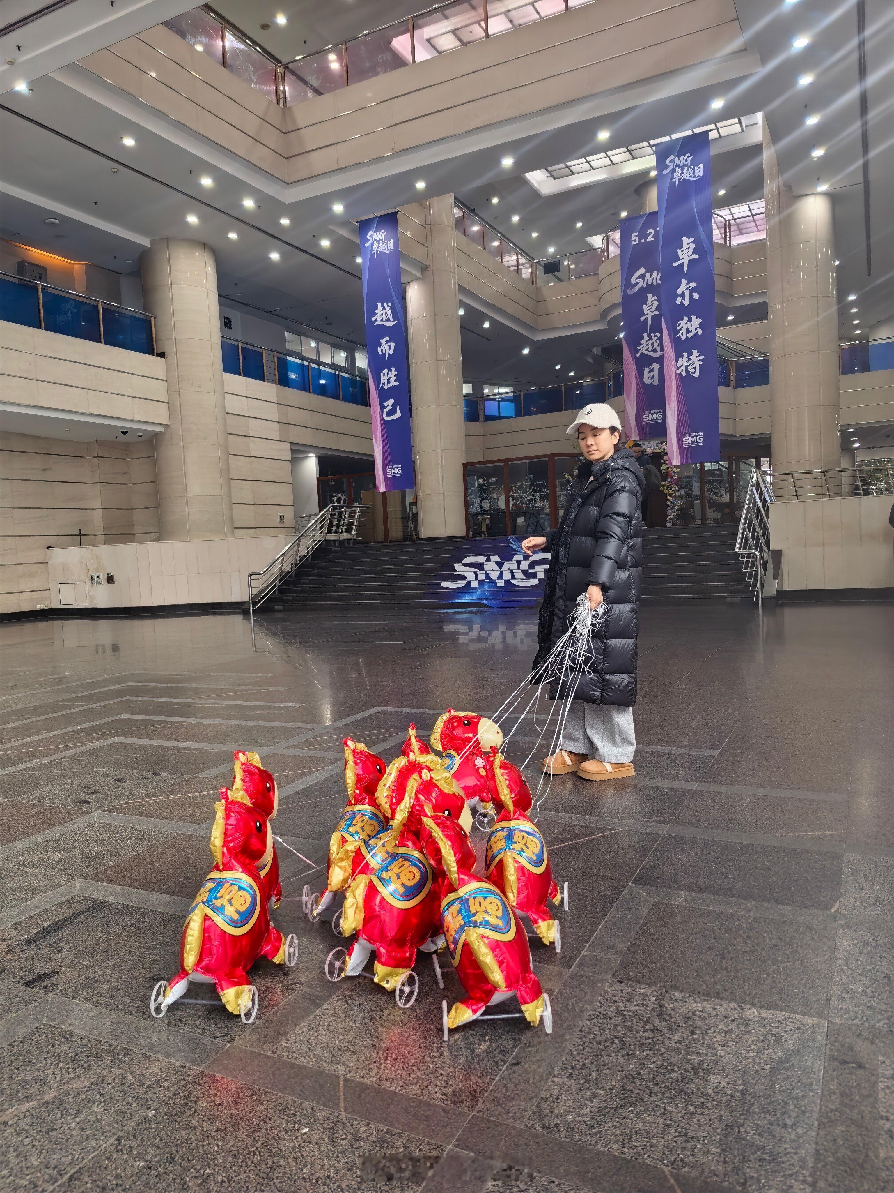 黄奕牵着9匹气球马上班 这组“移动祝福”回头率绝对百分百!黄奕化身时尚的快乐领航员,牵着七彩气球马队穿过喧嚣,目的地直指春晚的欢声笑语。