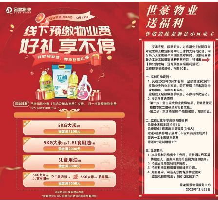 近段时间,在恒大名都小区,物业推出的“线下预缴物业费好礼享不停”优惠活动吸引了不少业主。业主李阿姨刚拎着一桶5L食用油和一袋大米从物业办公室出来,脸上满是笑意:“本来就打算缴物业费,现在还能领这些刚需用品,等于给家里省了一笔开销,太划算啦!”李阿姨说,只要缴清历史欠费,一次性预缴12个月或满1500元物业费,就能按预缴金额领取不同档位的民生好礼,最高可获得洗衣液或平底锅组合。