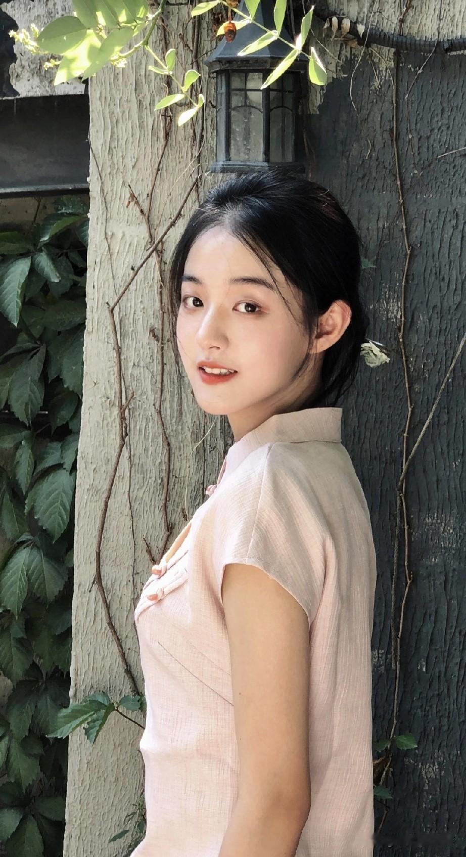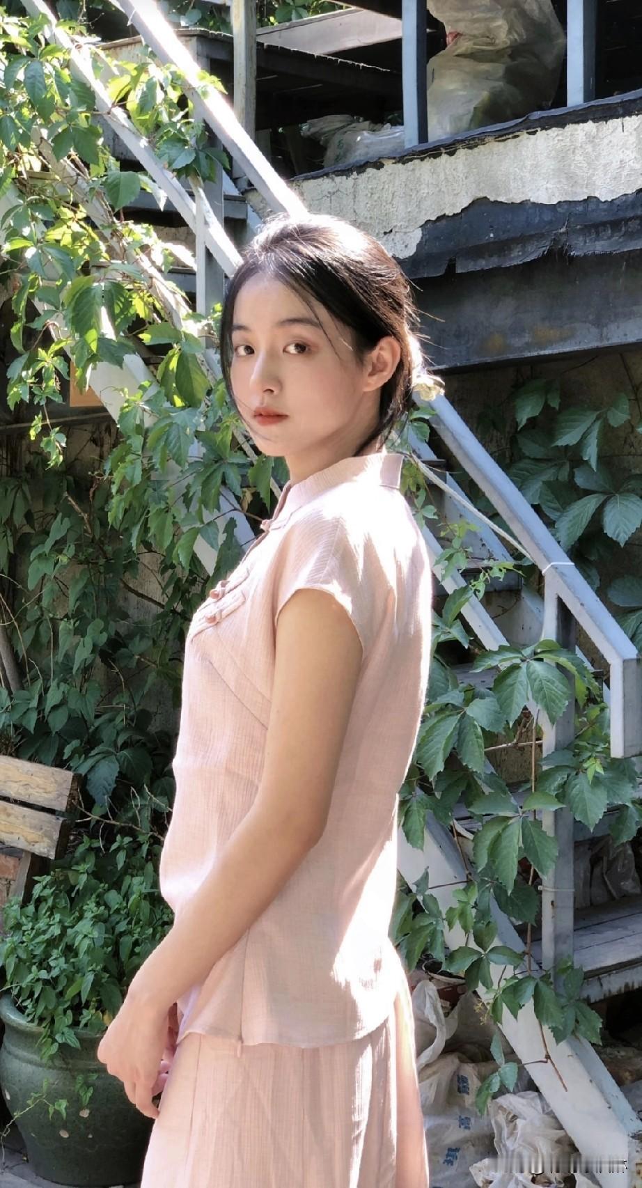 少女在树旁轻抚绿叶,阳光洒下温暖的光影