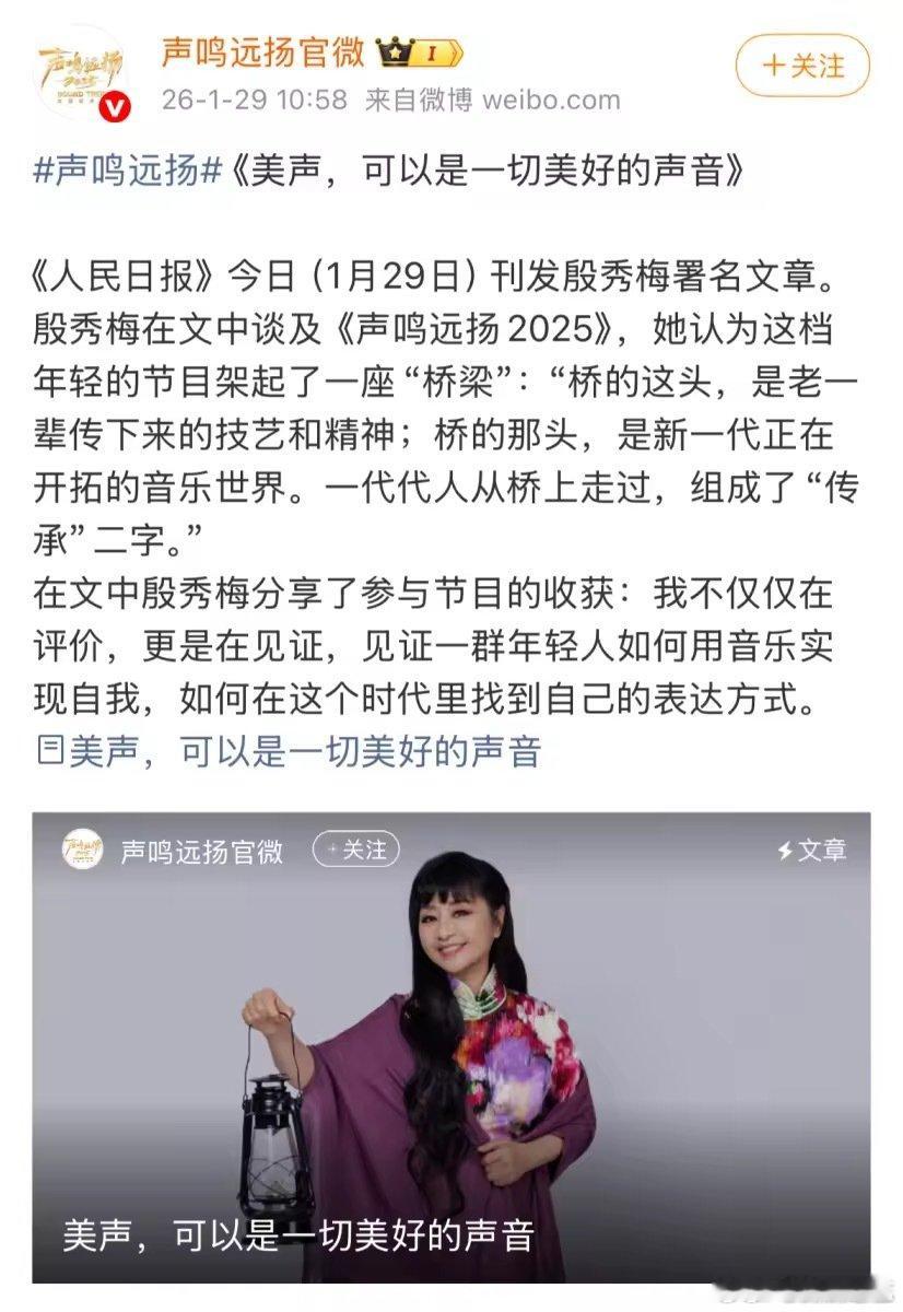 人民日报刊发殷秀梅署名文章声鸣远扬少年们以歌声为笔,绘就青春模样;殷秀梅以初心为灯,照亮音乐前路,这档歌唱比赛,藏着最动人的传承与成长~