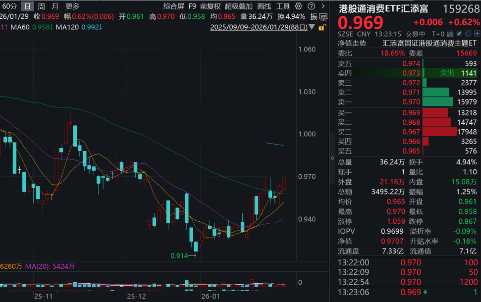 港股消费飘红,港股通消费ETF汇添富(159268)涨近1%,盘中成交额超3400万元!热门成分股中,海底捞涨超3%,安踏体育、李宁涨超2%,青岛啤酒股份涨超1%,蒙牛乳业涨近1%(成分股仅做展示,不作为个股推介)。