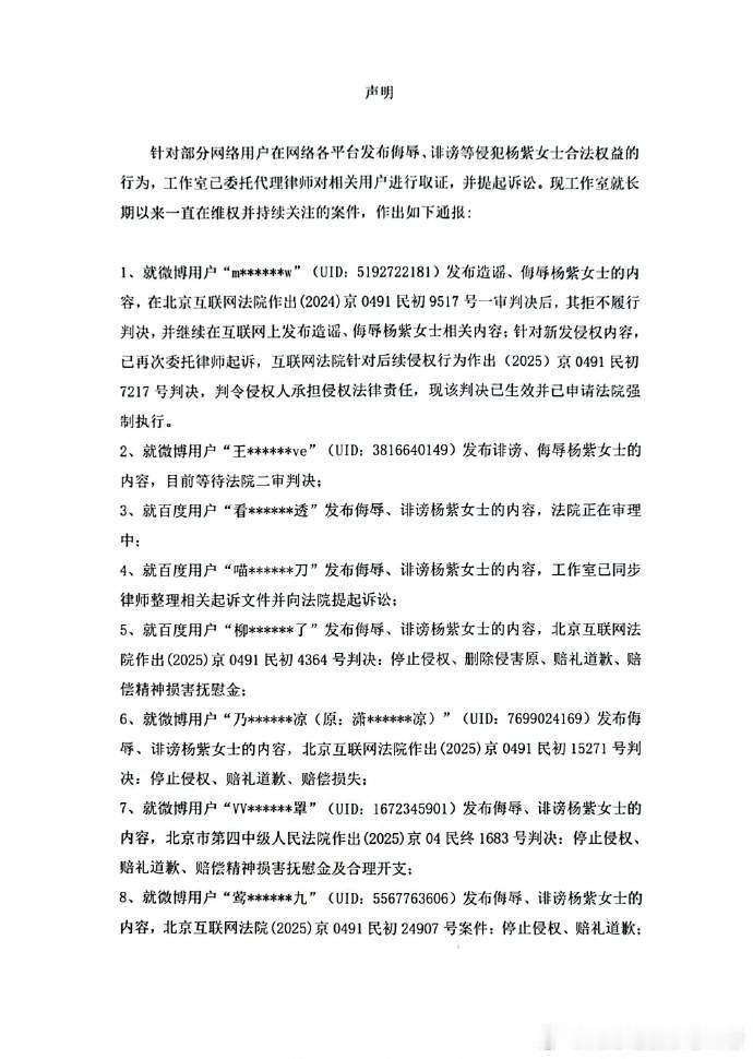 杨紫工作室全平台告黑进展杨紫工作室发布全平台告黑进展,针对侵权行为不仅长期维权,还会依法追责到底